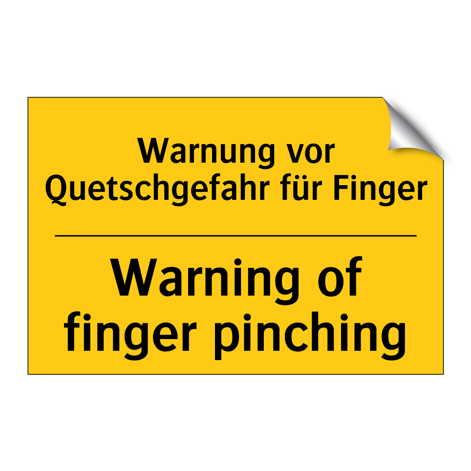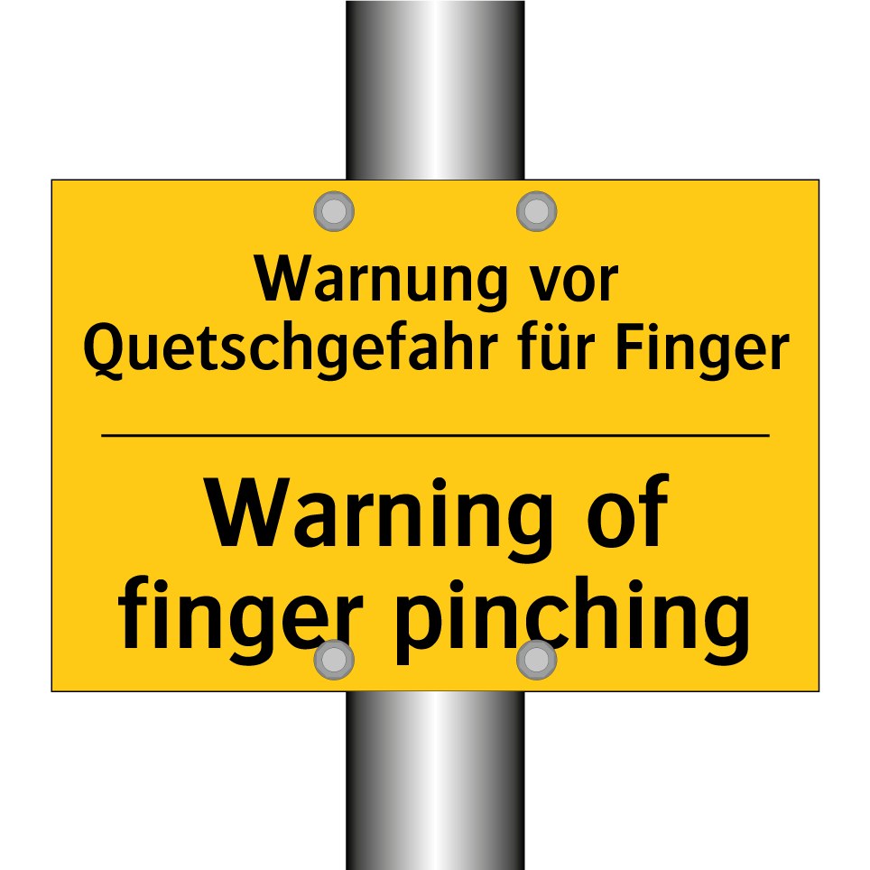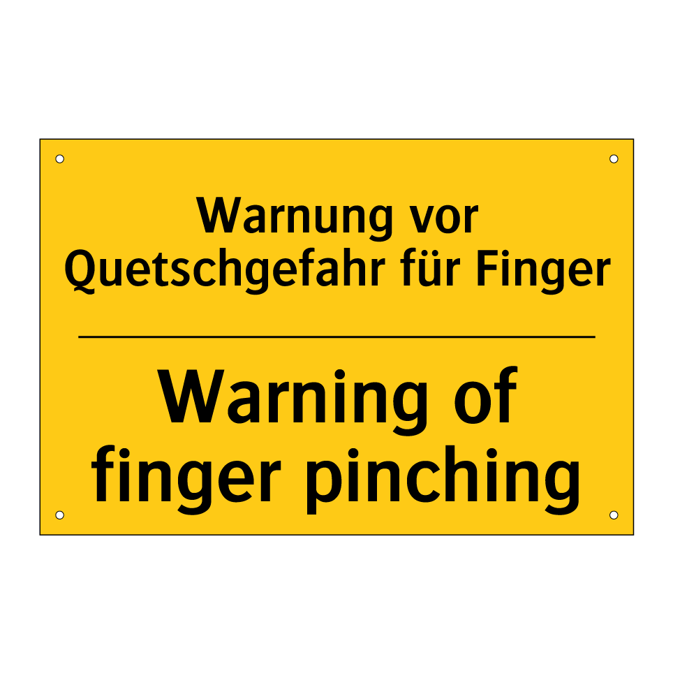 Zweisprachiges Warnschild mit deutschem Text Warnung vor Quetschgefahr für Finger und englischem Text Warning of finger pinching