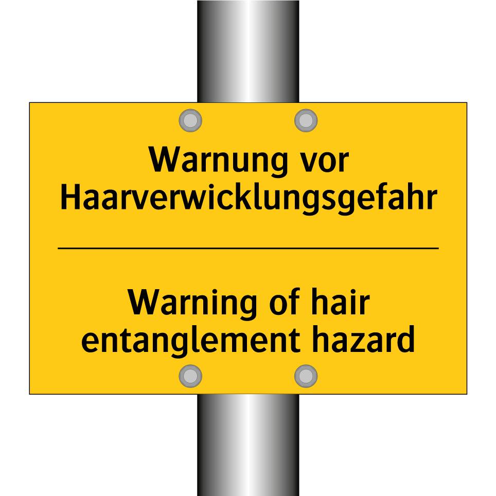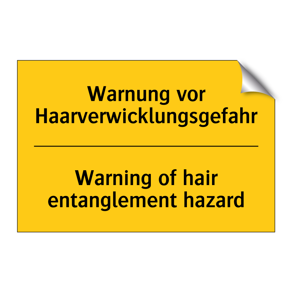 Zweisprachiges Warnschild mit deutschem Text Warnung vor Haarverwicklungsgefahr und englischem Text Warning of hair entanglement hazard