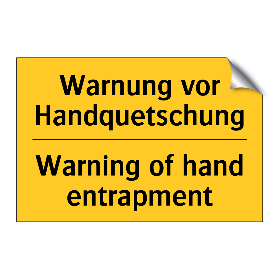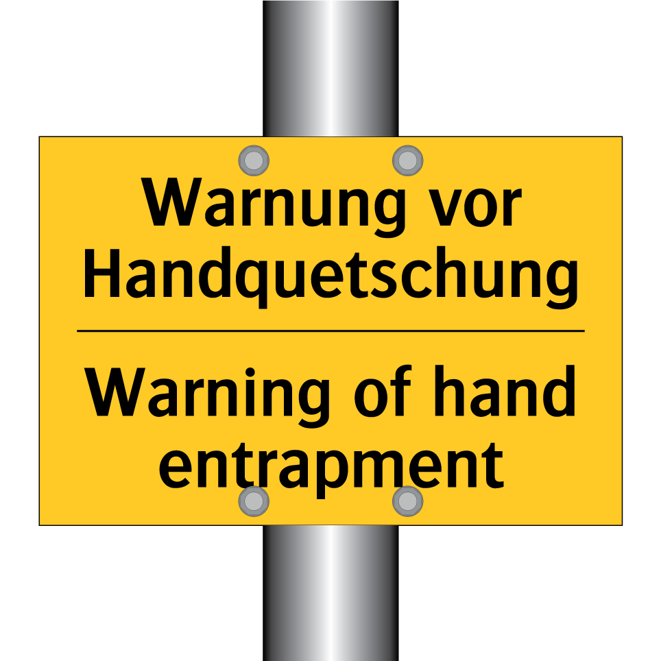 Zweisprachiges Warnschild mit deutschem Text Warnung vor Handquetschung und englischem Text Warning of hand entrapment