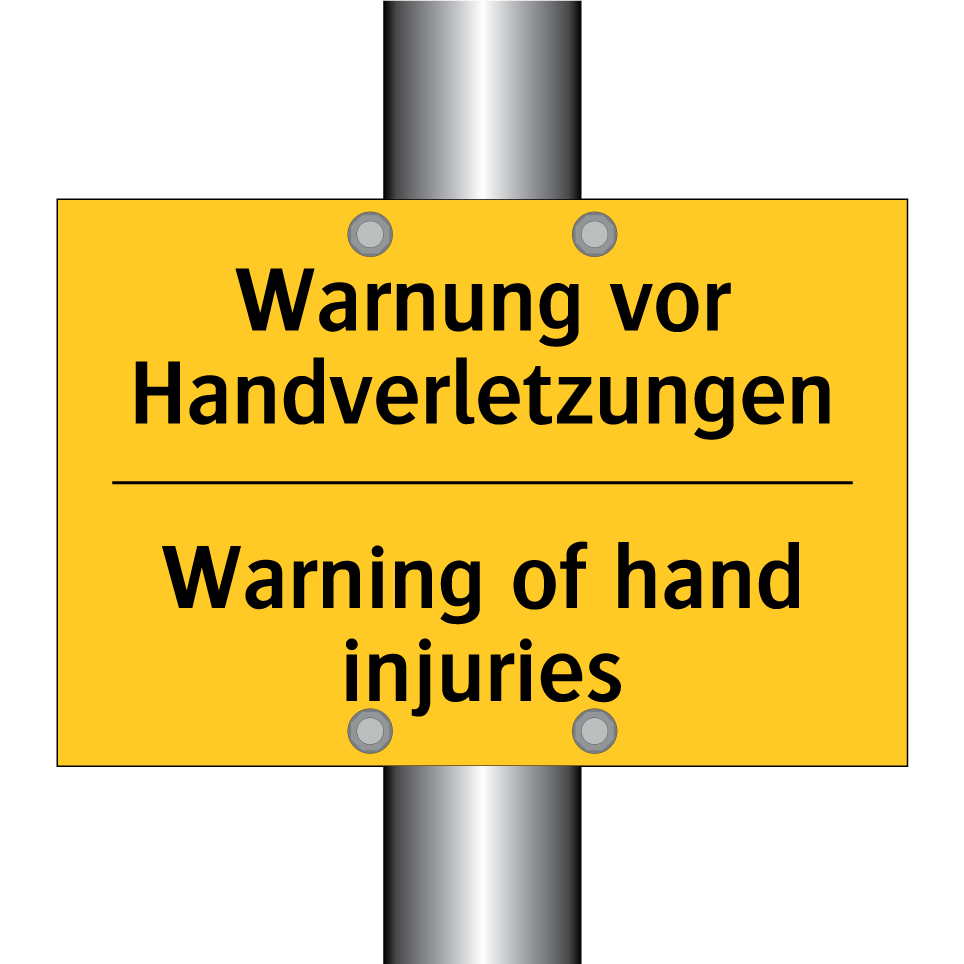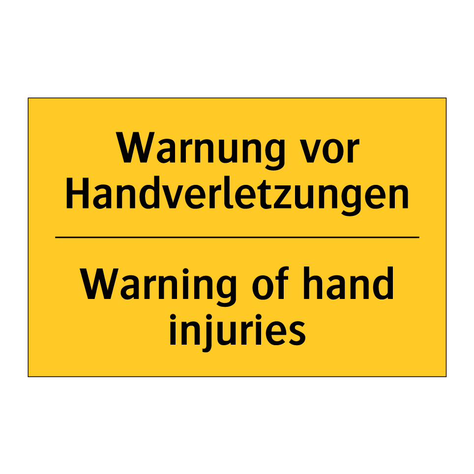 Zweisprachiges Warnschild mit deutschem Text Warnung vor Handverletzungen und englischem Text Warning of hand injuries