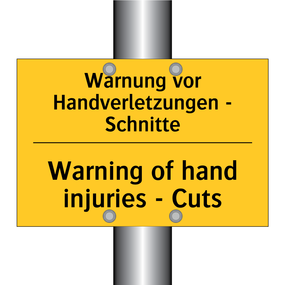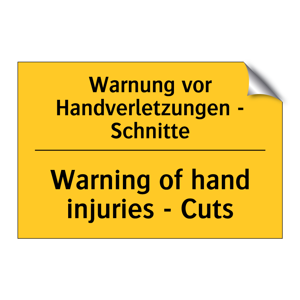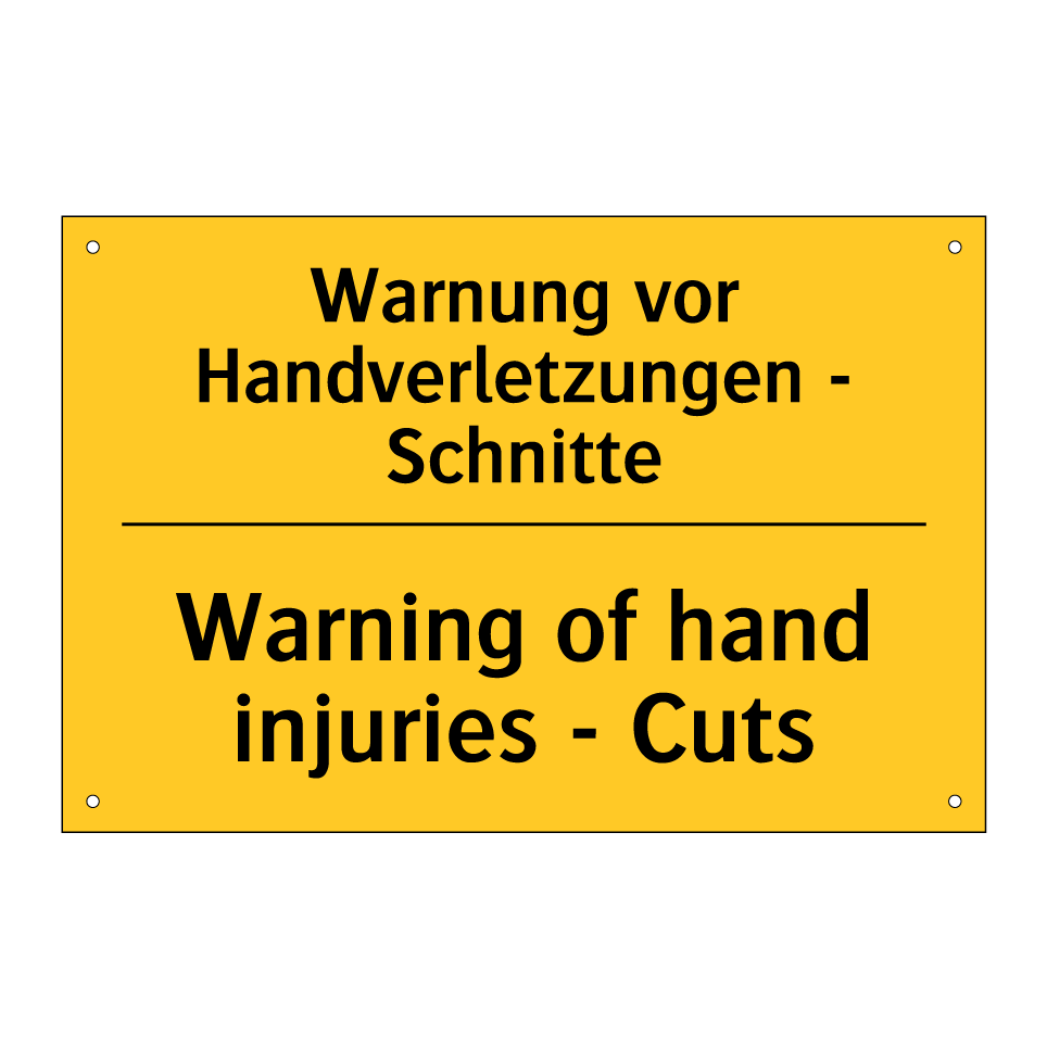 Zweisprachiges Warnschild mit deutschem Text Warnung vor Handverletzungen - Schnitte und englischem Text Warning of hand injuries - Cuts