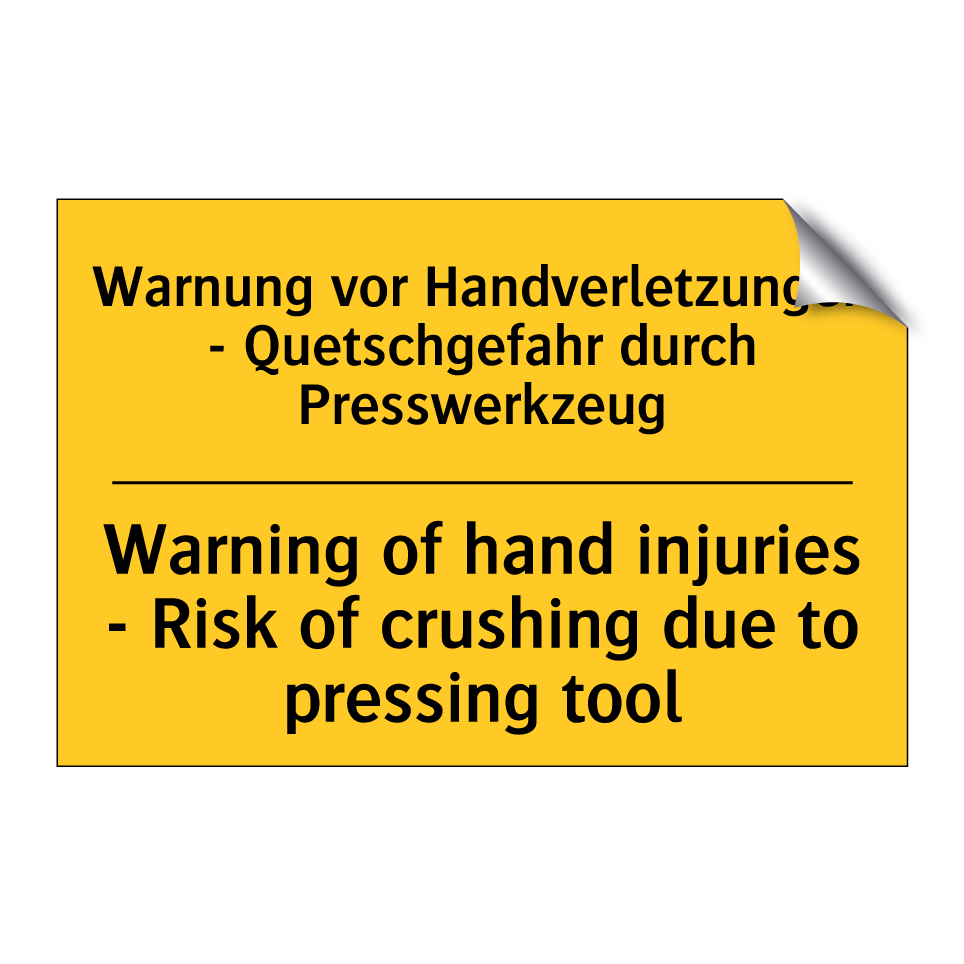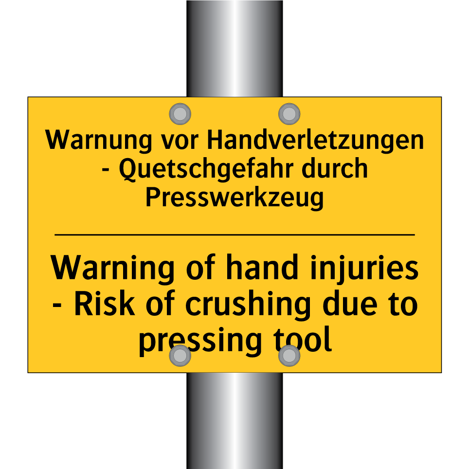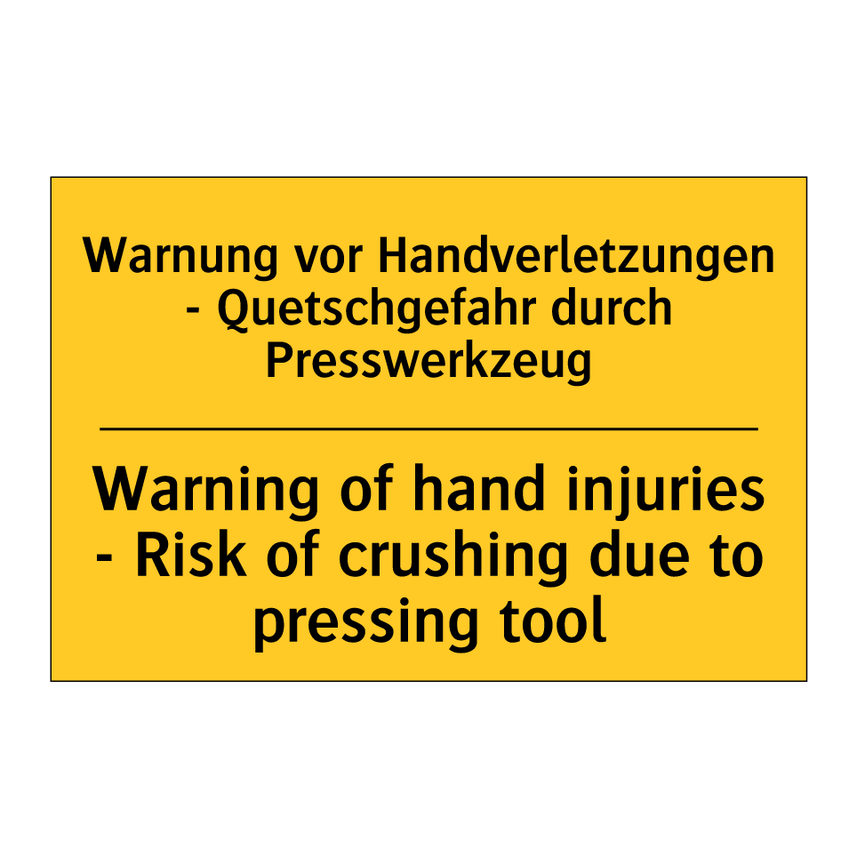 Zweisprachiges Warnschild mit deutschem Text Warnung vor Handverletzungen - Quetschgefahr durch Presswerkzeug und englischem Text Warning of hand injuries - Risk of crushing due to pressing tool