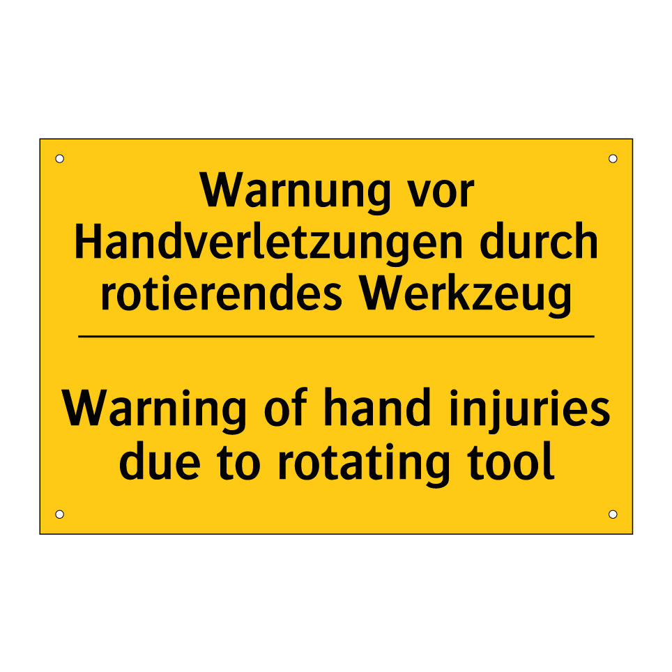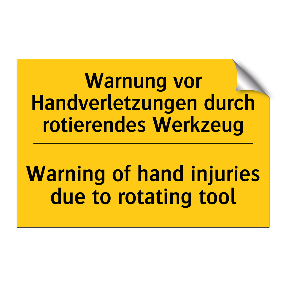Zweisprachiges Warnschild mit deutschem Text Warnung vor Handverletzungen durch rotierendes Werkzeug und englischem Text Warning of hand injuries due to rotating tool