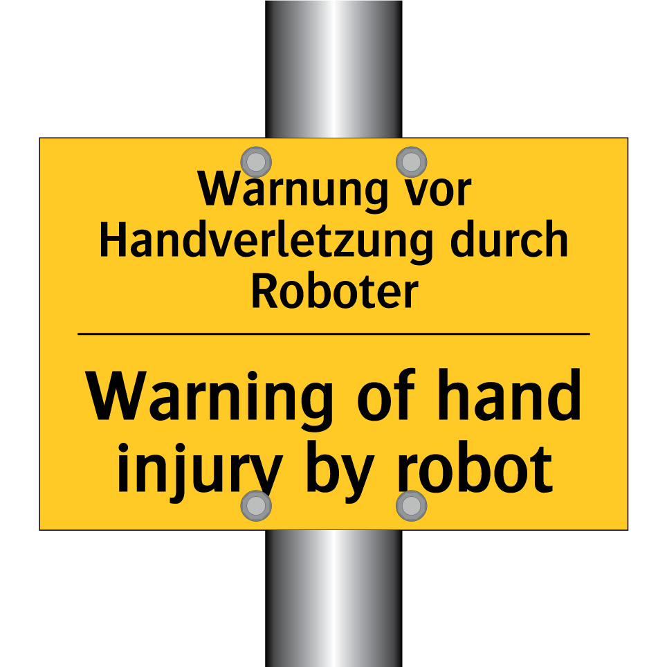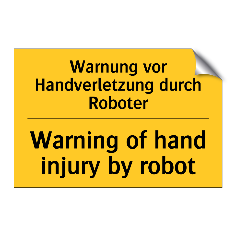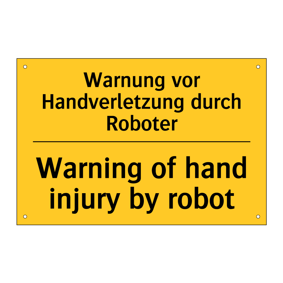 Zweisprachiges Warnschild mit deutschem Text Warnung vor Handverletzung durch Roboter und englischem Text Warning of hand injury by robot