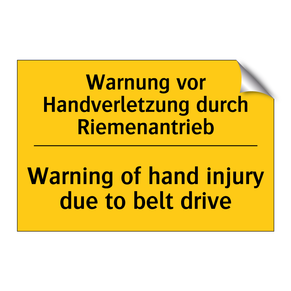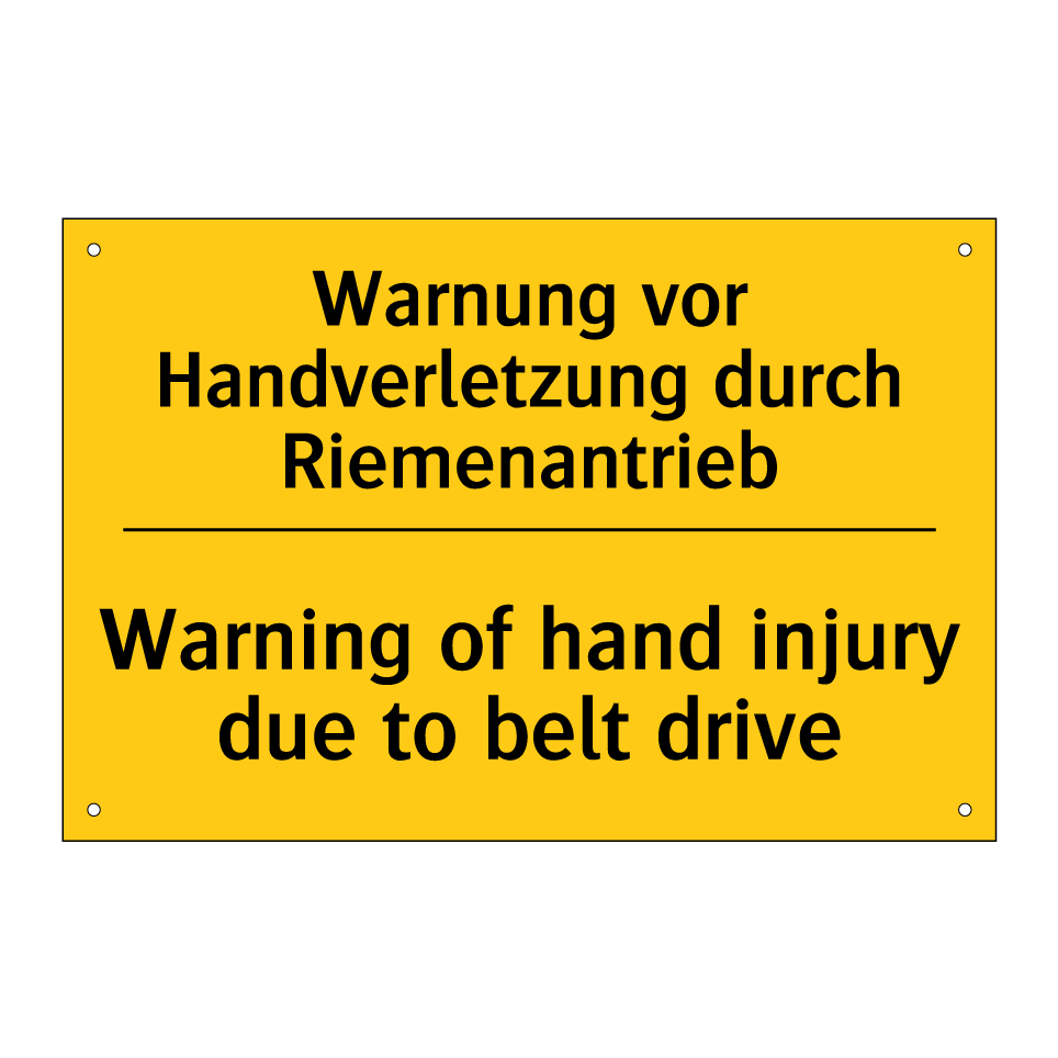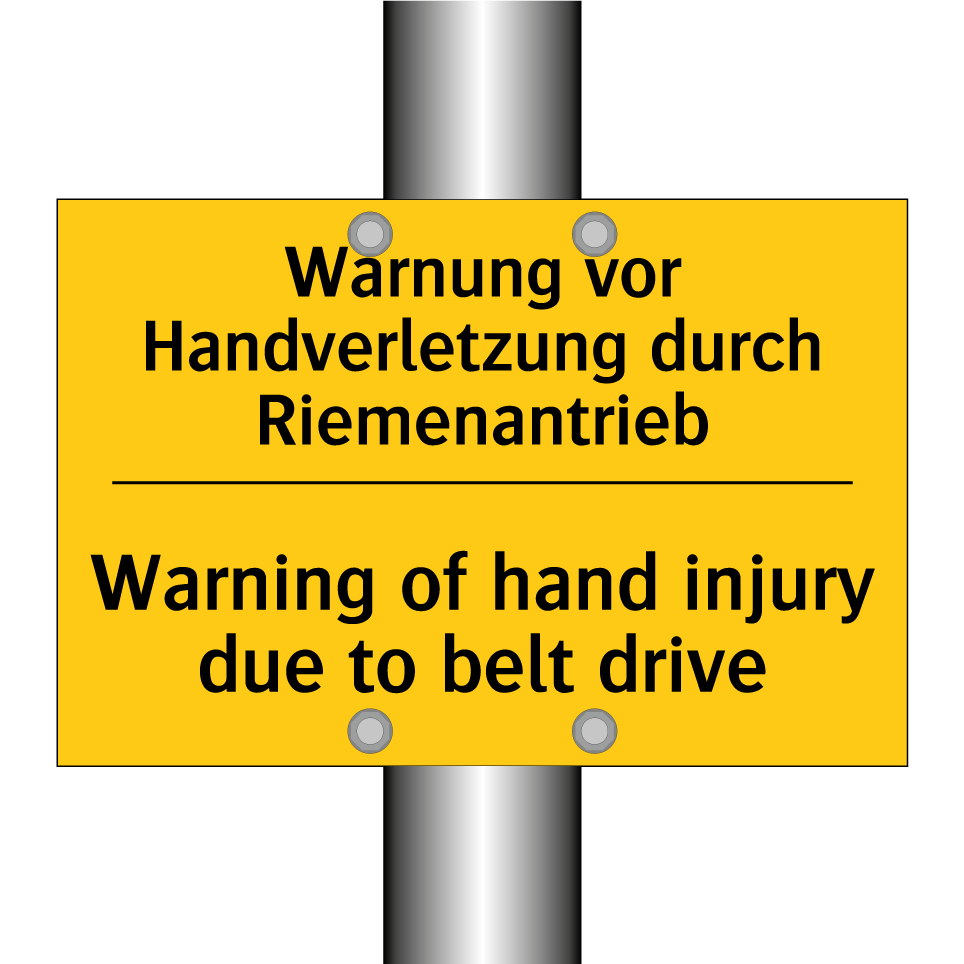 Zweisprachiges Warnschild mit deutschem Text Warnung vor Handverletzung durch Riemenantrieb und englischem Text Warning of hand injury due to belt drive