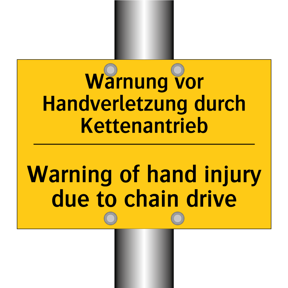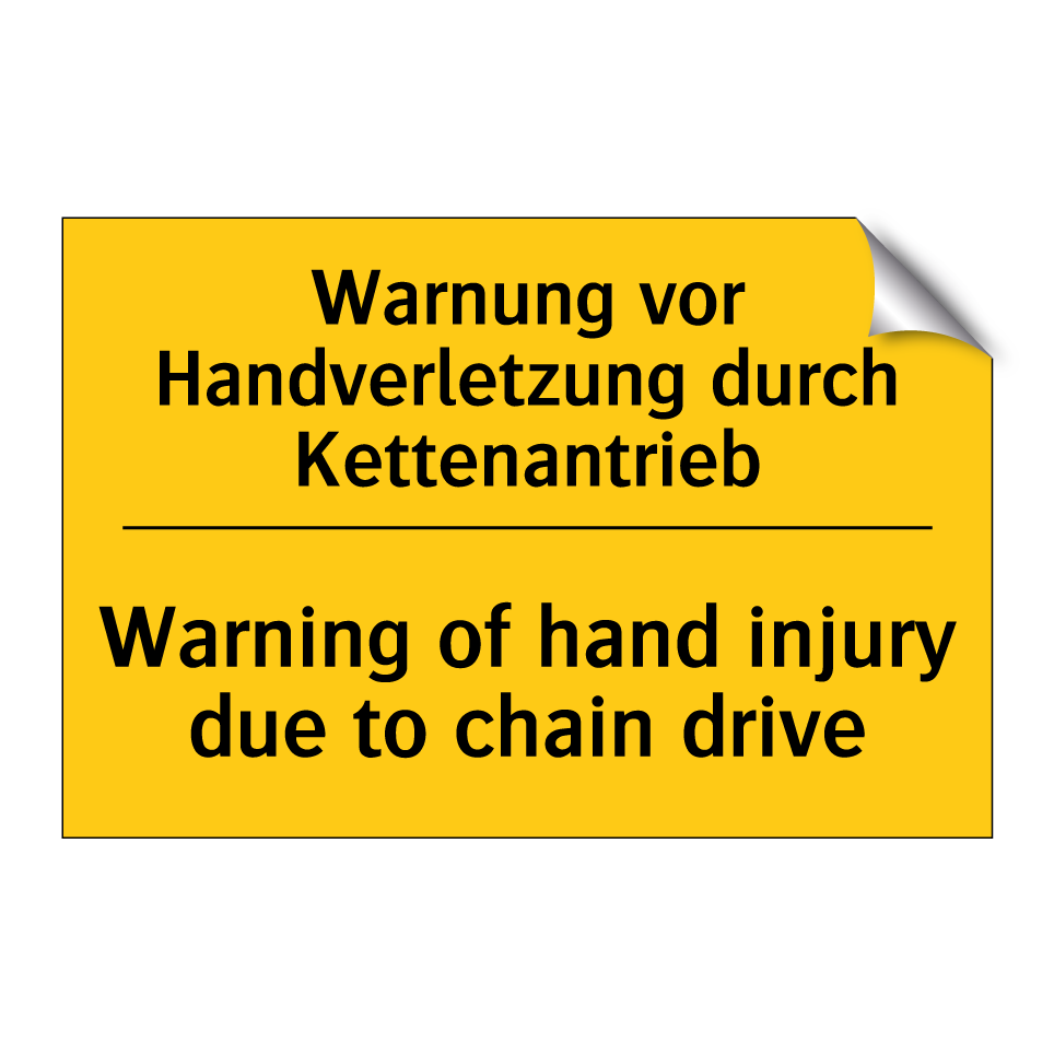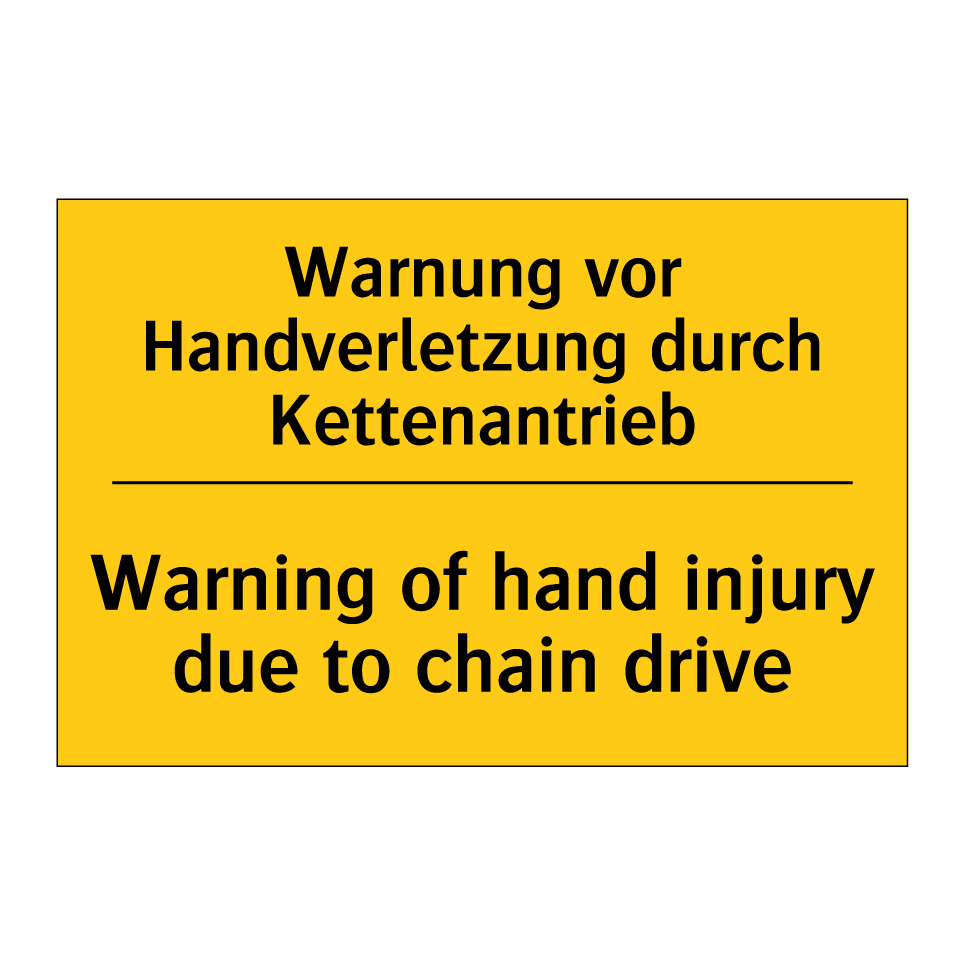 Zweisprachiges Warnschild mit deutschem Text Warnung vor Handverletzung durch Kettenantrieb und englischem Text Warning of hand injury due to chain drive