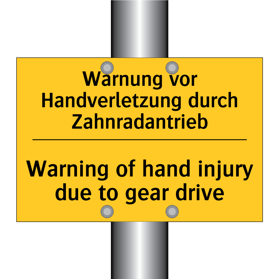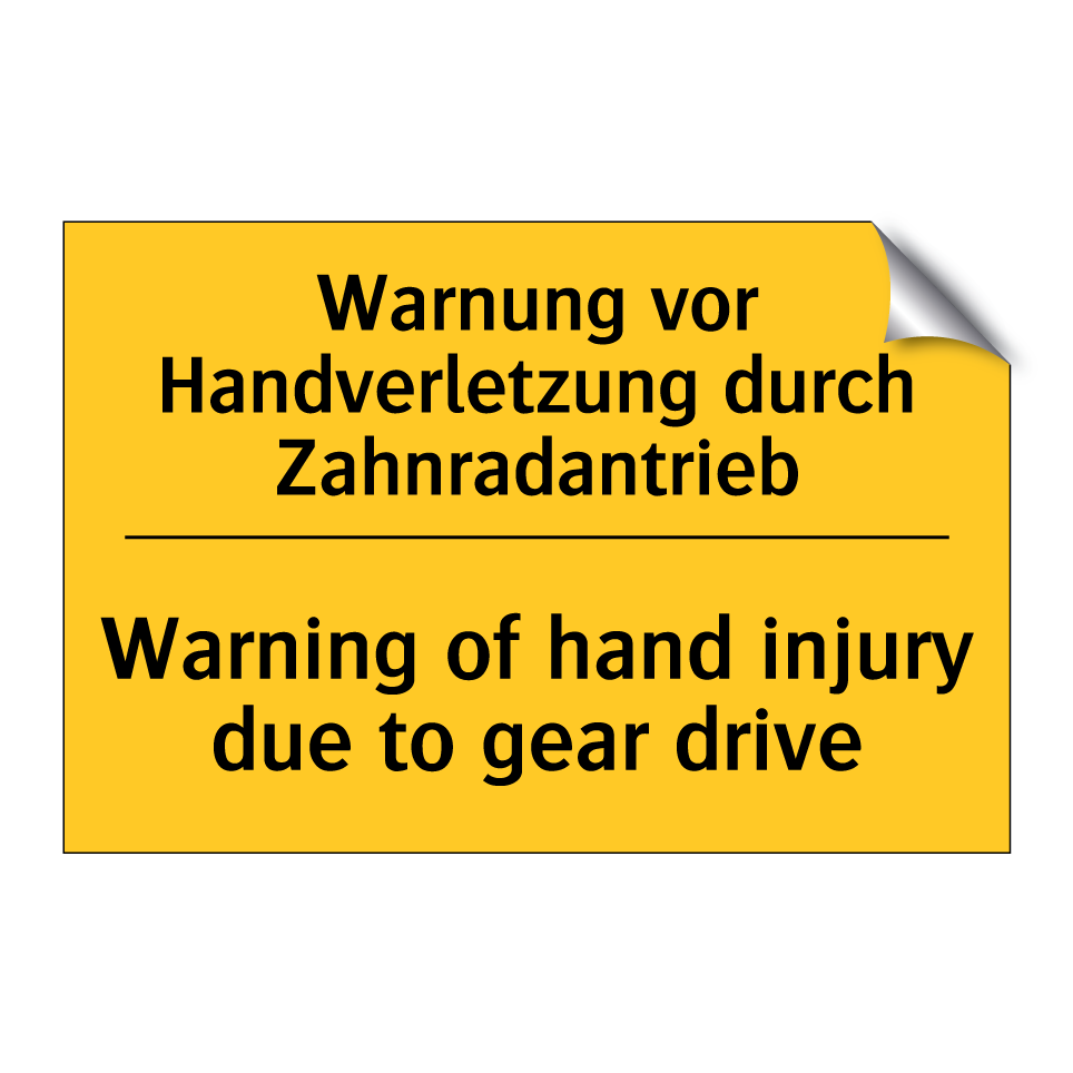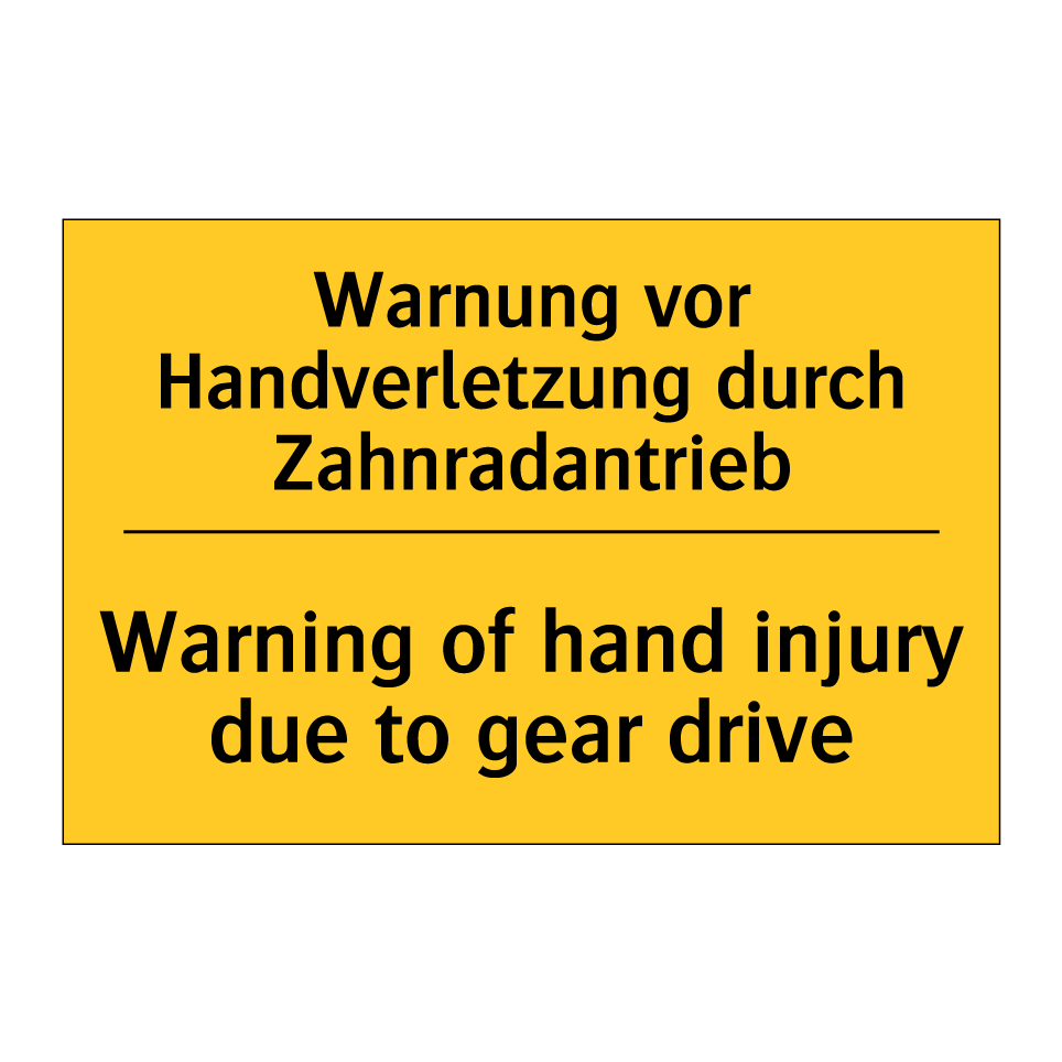 Zweisprachiges Warnschild mit deutschem Text Warnung vor Handverletzung durch Zahnradantrieb und englischem Text Warning of hand injury due to gear drive