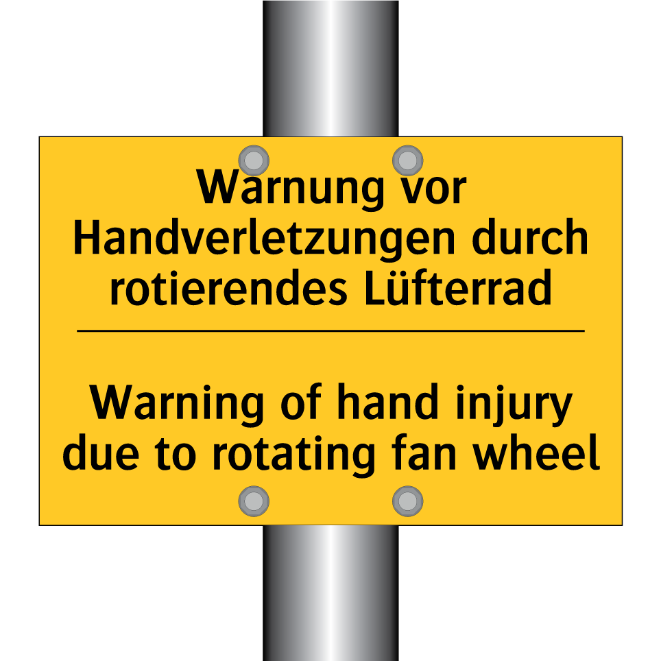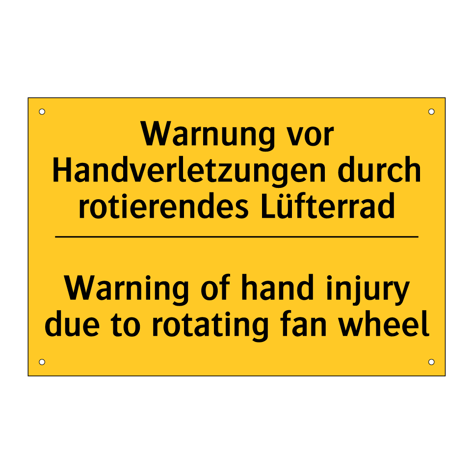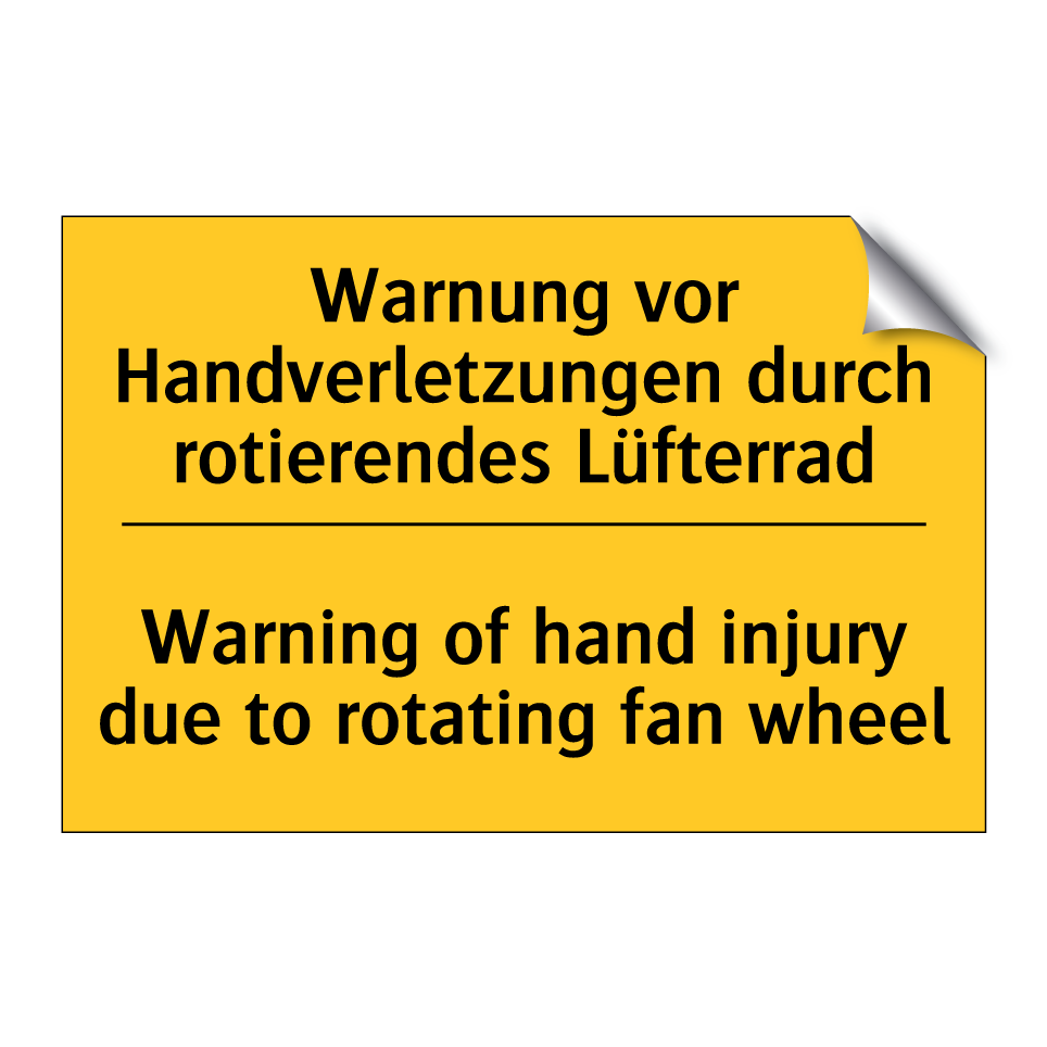 Zweisprachiges Warnschild mit deutschem Text Warnung vor Handverletzungen durch rotierendes Lüfterrad und englischem Text Warning of hand injury due to rotating fan wheel