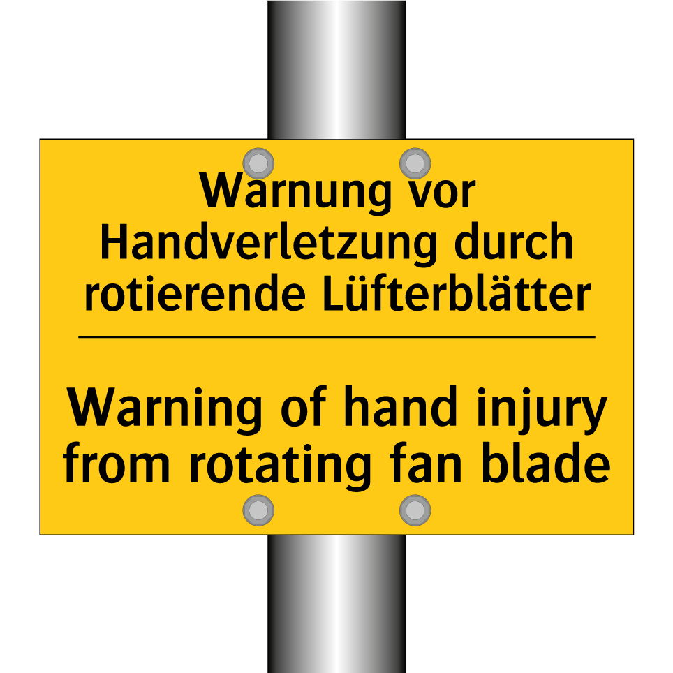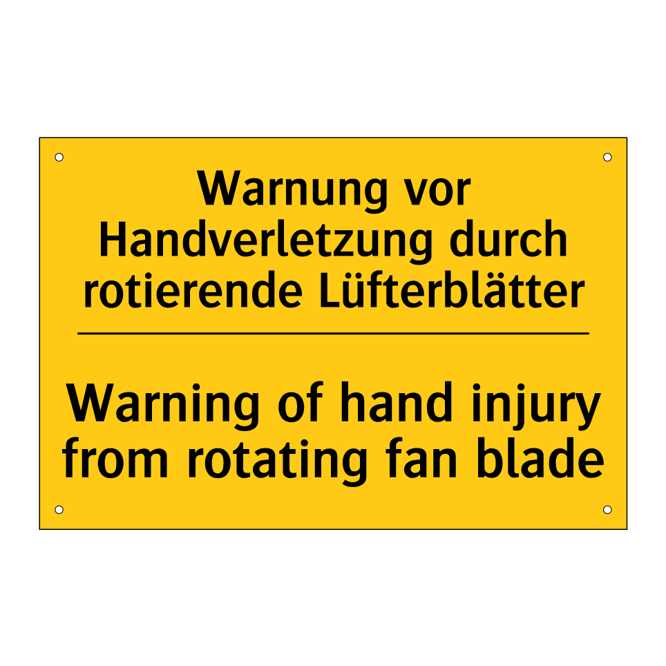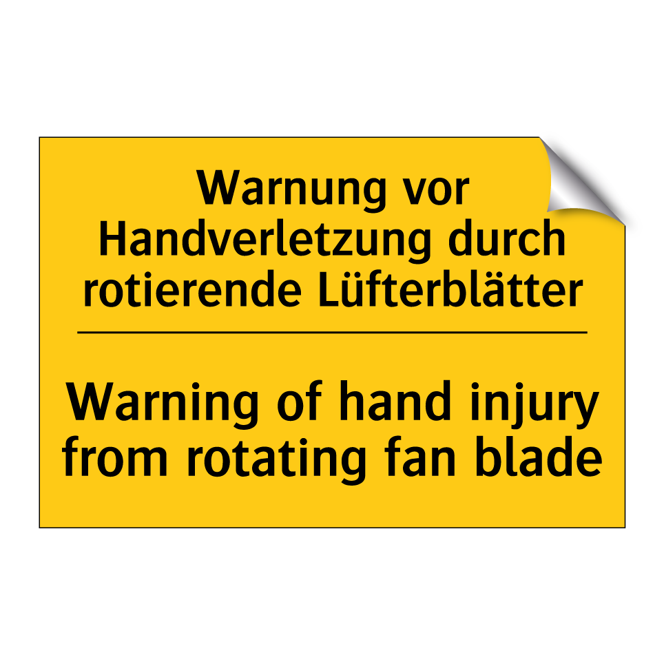 Zweisprachiges Warnschild mit deutschem Text Warnung vor Handverletzung durch rotierende Lüfterblätter und englischem Text Warning of hand injury from rotating fan blade