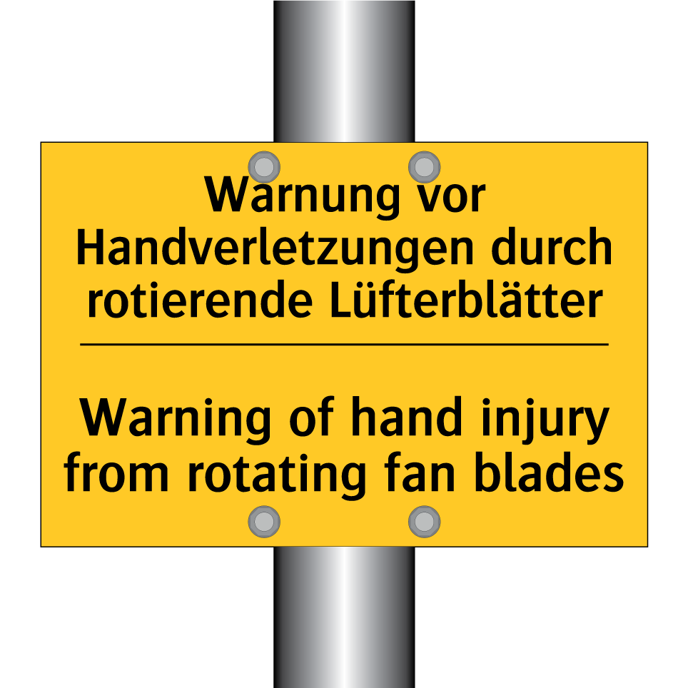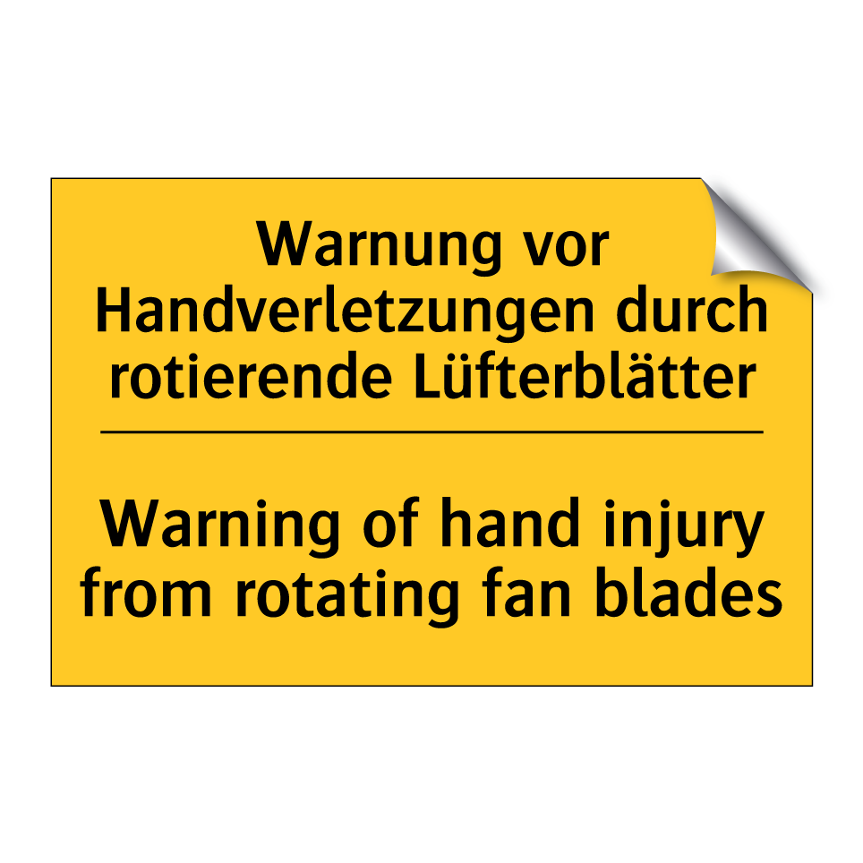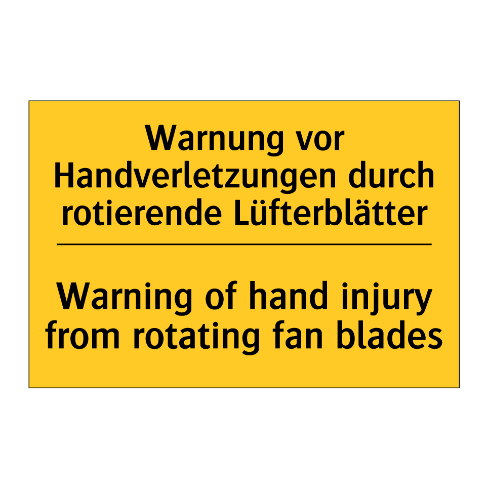 Zweisprachiges Warnschild mit deutschem Text Warnung vor Handverletzungen durch rotierende Lüfterblätter und englischem Text Warning of hand injury from rotating fan blades
