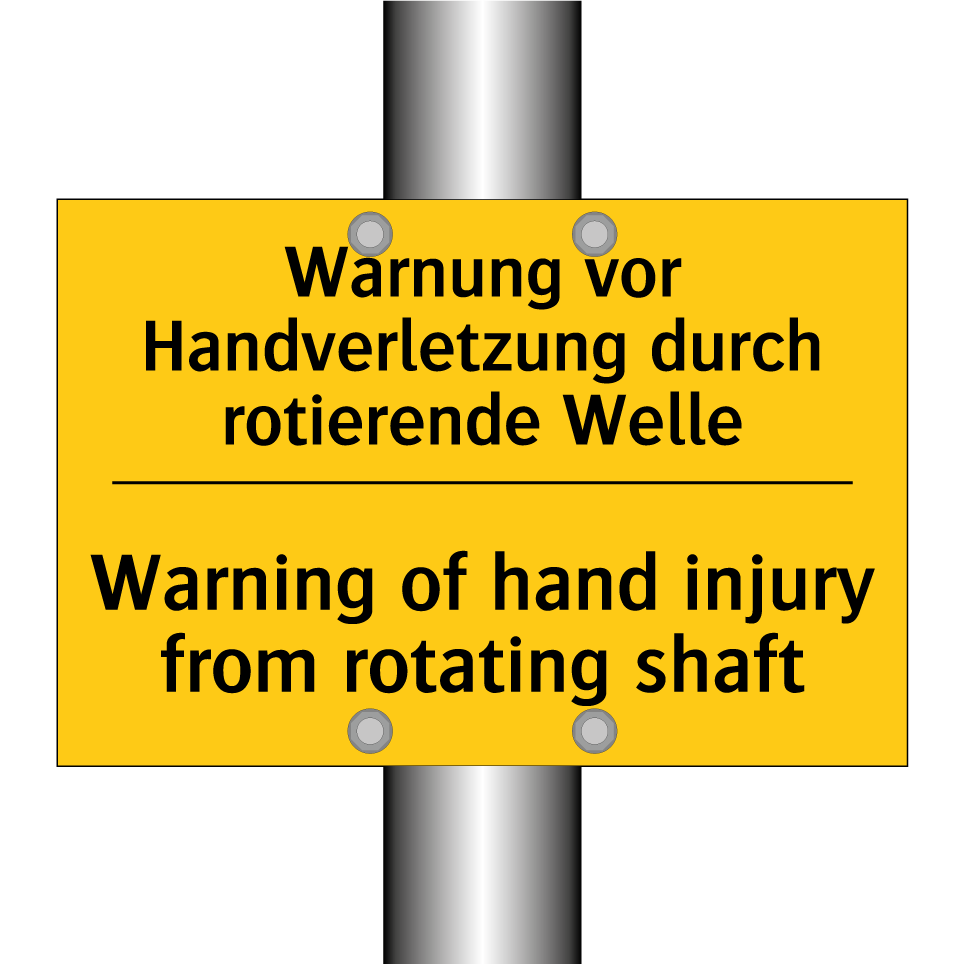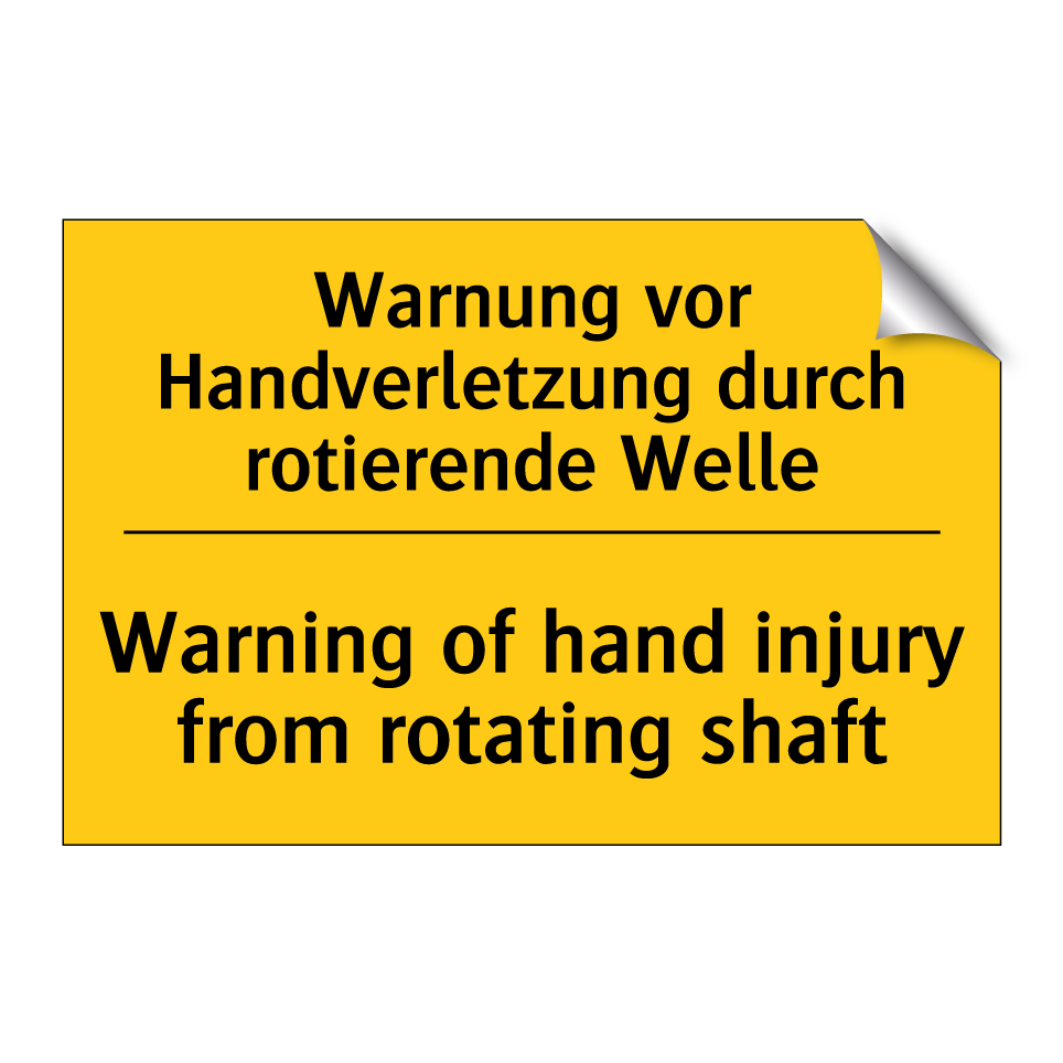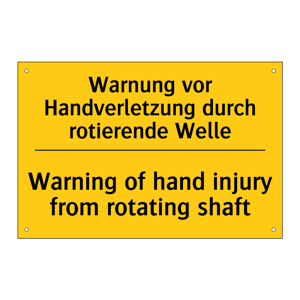 Zweisprachiges Warnschild mit deutschem Text Warnung vor Handverletzung durch rotierende Welle und englischem Text Warning of hand injury from rotating shaft
