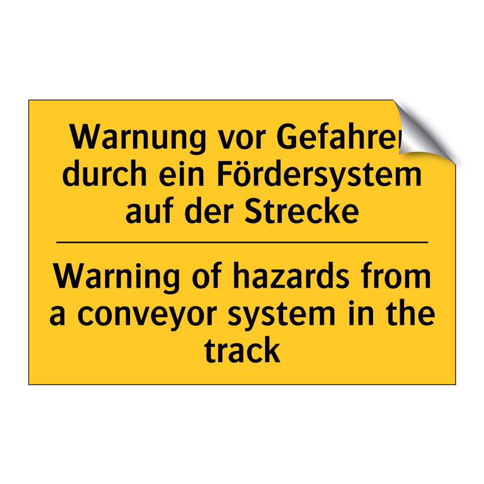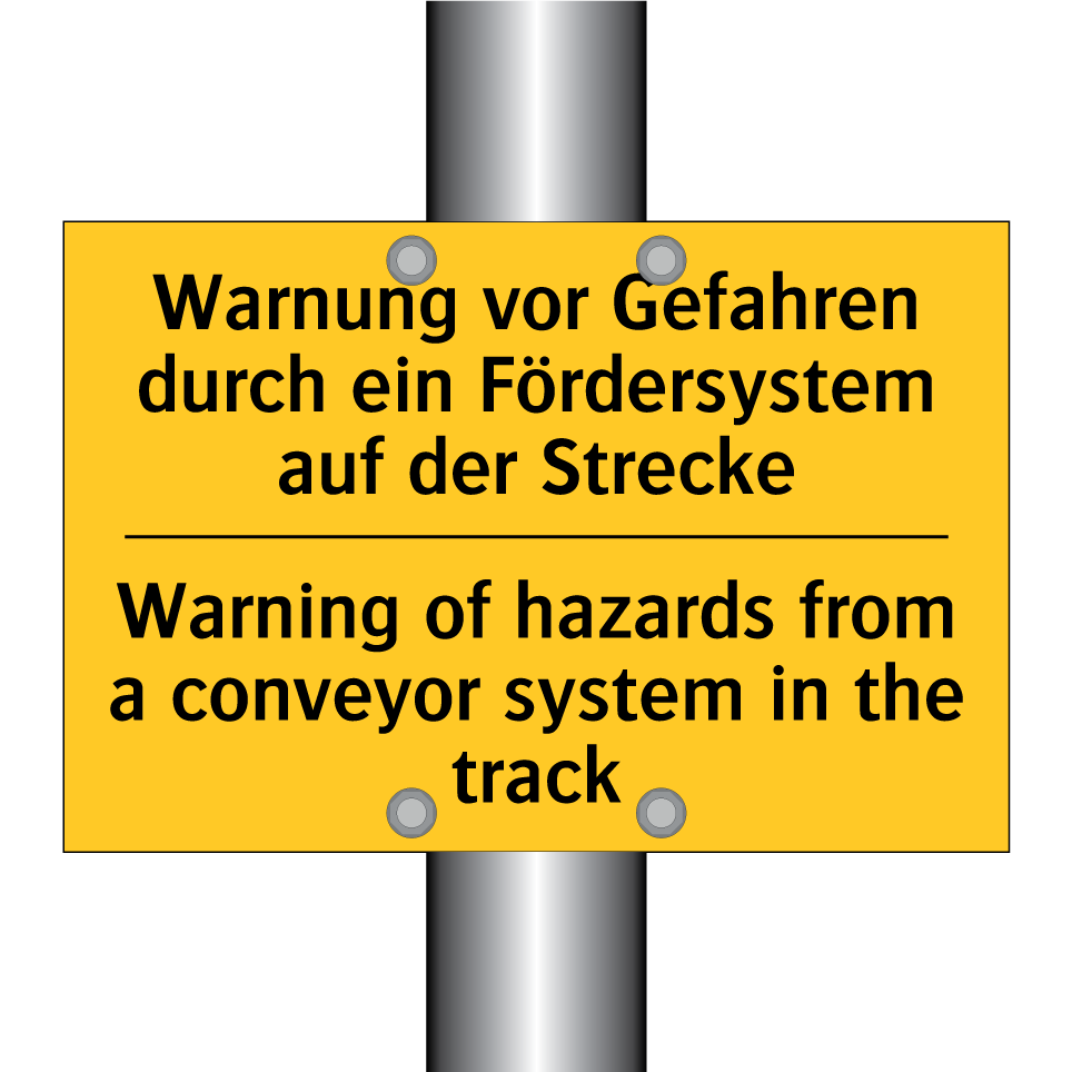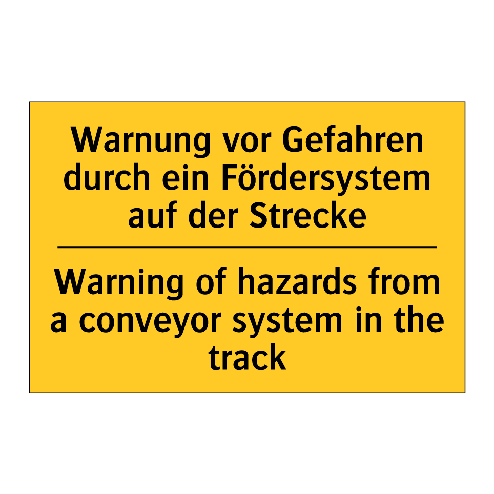 Zweisprachiges Warnschild mit deutschem Text Warnung vor Gefahren durch ein Fördersystem auf der Strecke und englischem Text Warning of hazards from a conveyor system in the track