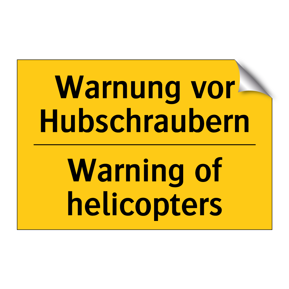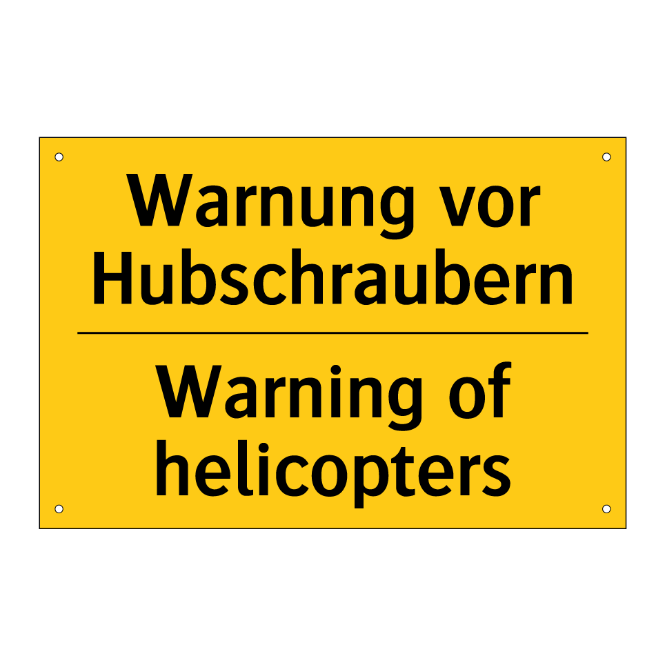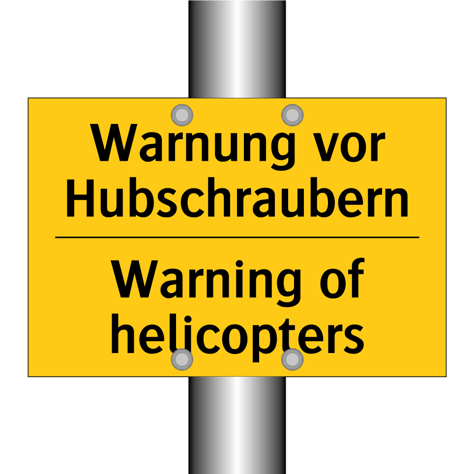 Zweisprachiges Warnschild mit deutschem Text Warnung vor Hubschraubern und englischem Text Warning of helicopters