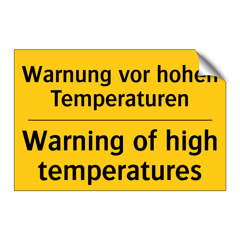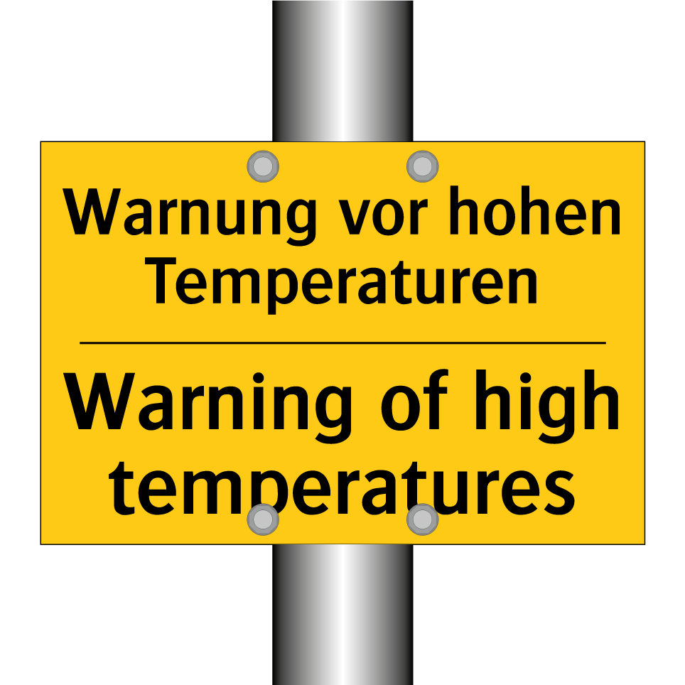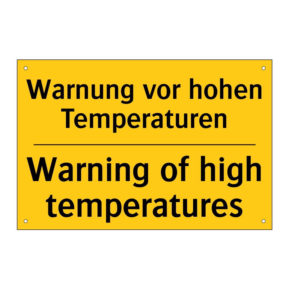 Zweisprachiges Warnschild mit deutschem Text Warnung vor hohen Temperaturen und englischem Text Warning of high temperatures