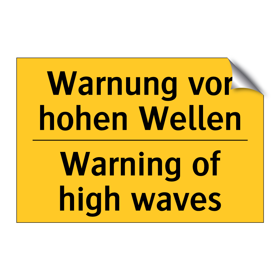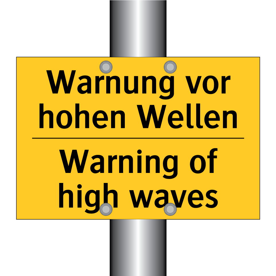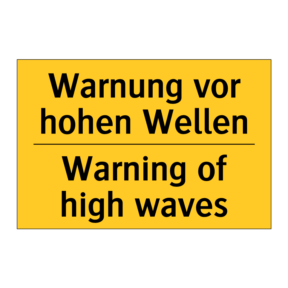 Zweisprachiges Warnschild mit deutschem Text Warnung vor hohen Wellen und englischem Text Warning of high waves