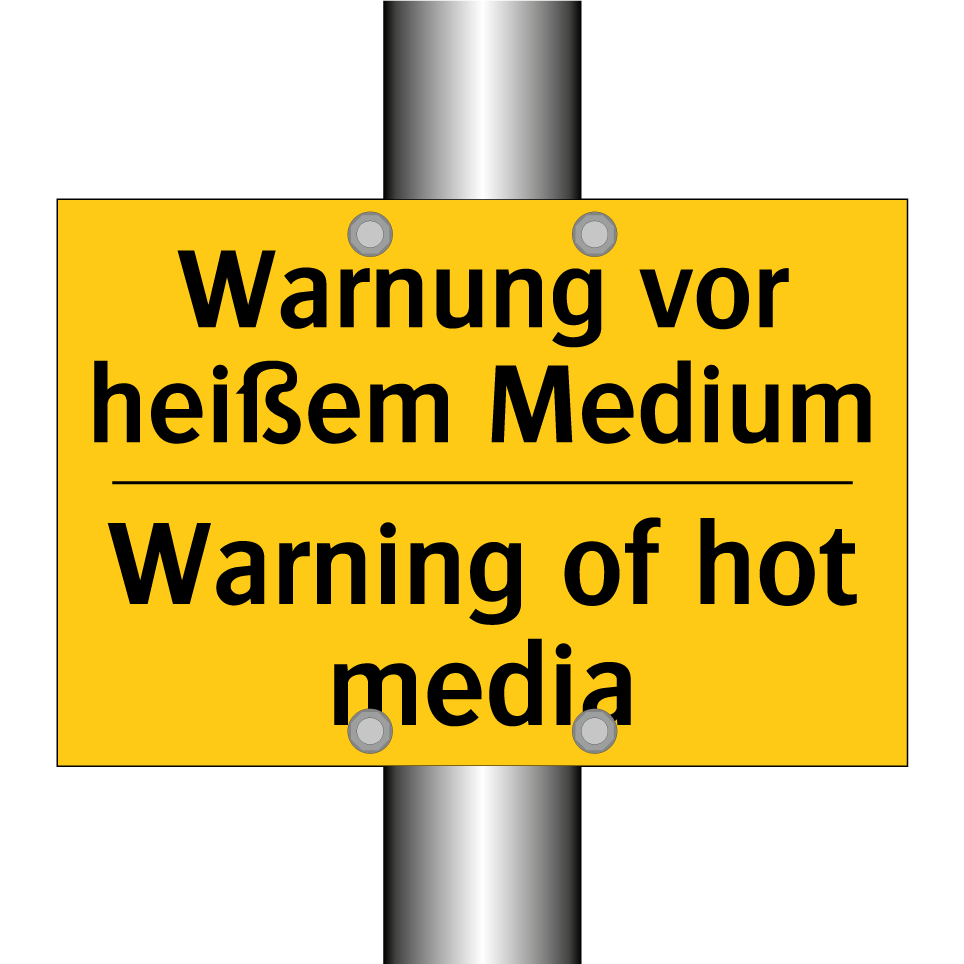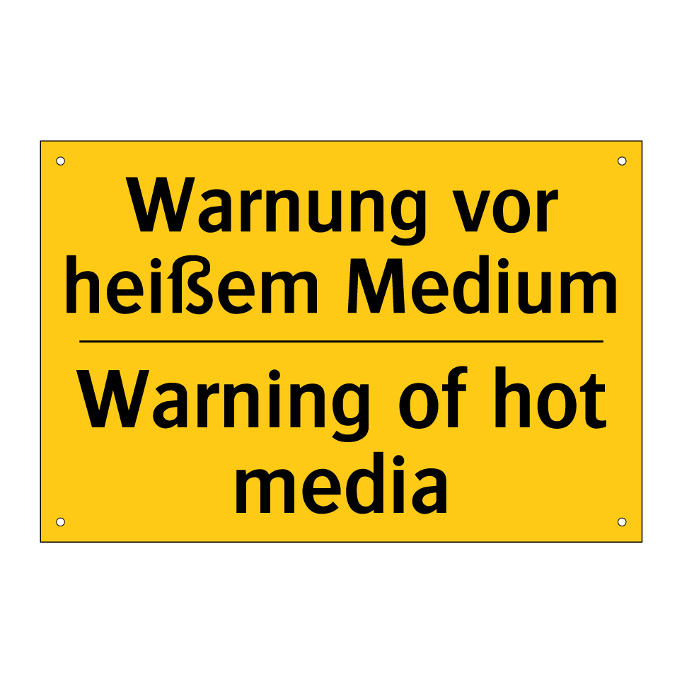 Zweisprachiges Warnschild mit deutschem Text Warnung vor heißem Medium und englischem Text Warning of hot media