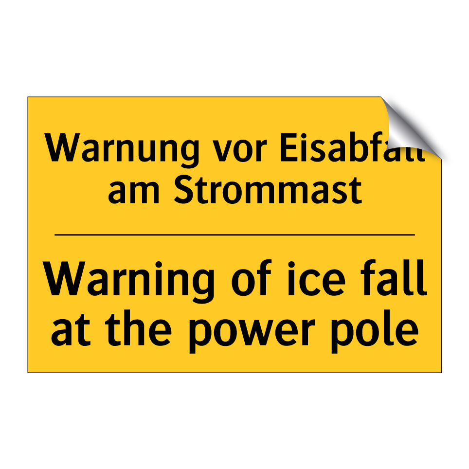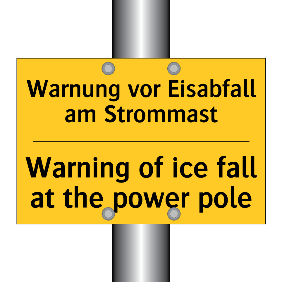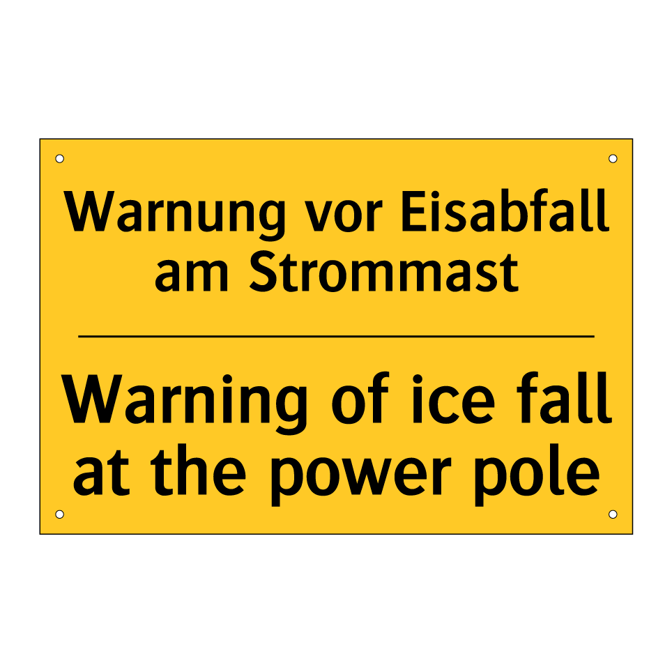 Zweisprachiges Warnschild mit deutschem Text Warnung vor Eisabfall am Strommast und englischem Text Warning of ice fall at the power pole