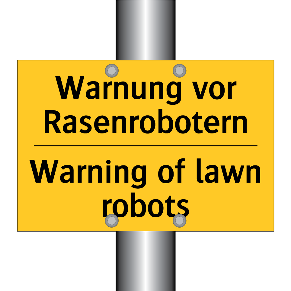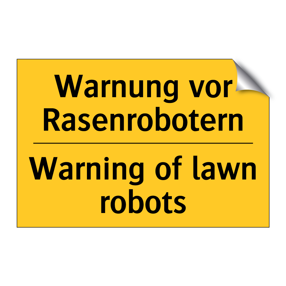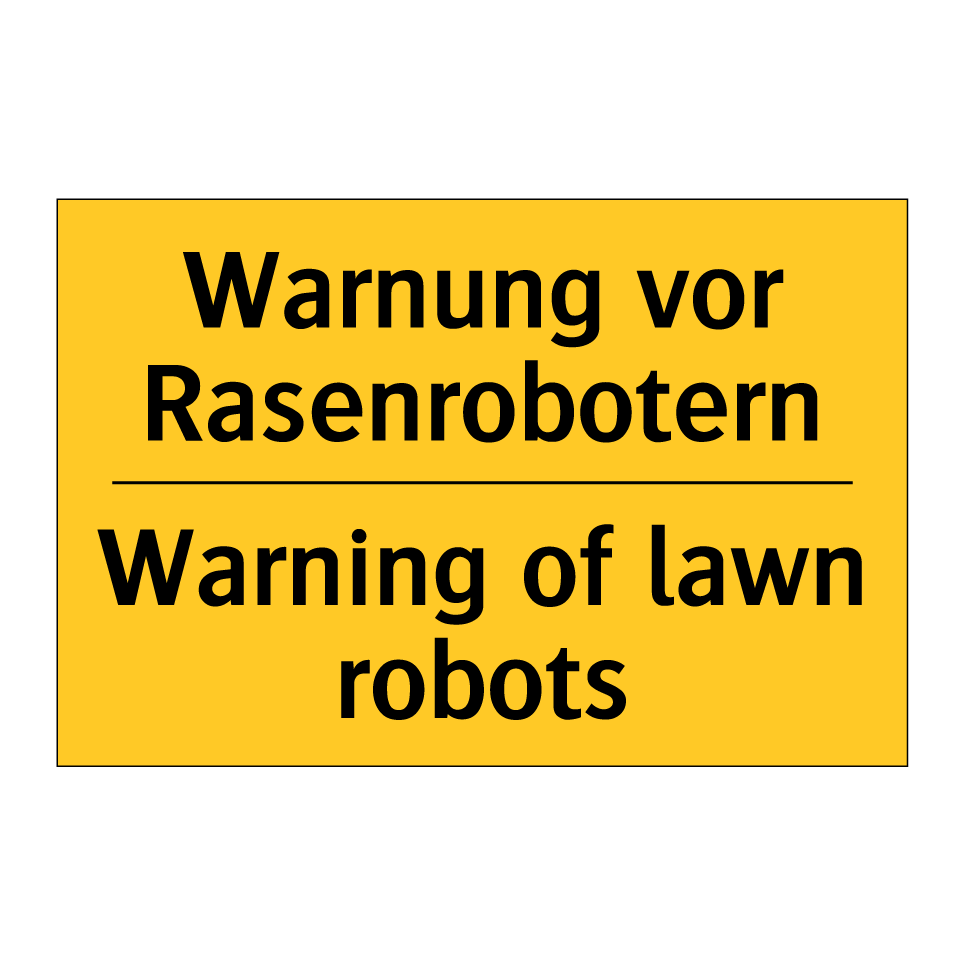 Zweisprachiges Warnschild mit deutschem Text Warnung vor Rasenrobotern und englischem Text Warning of lawn robots