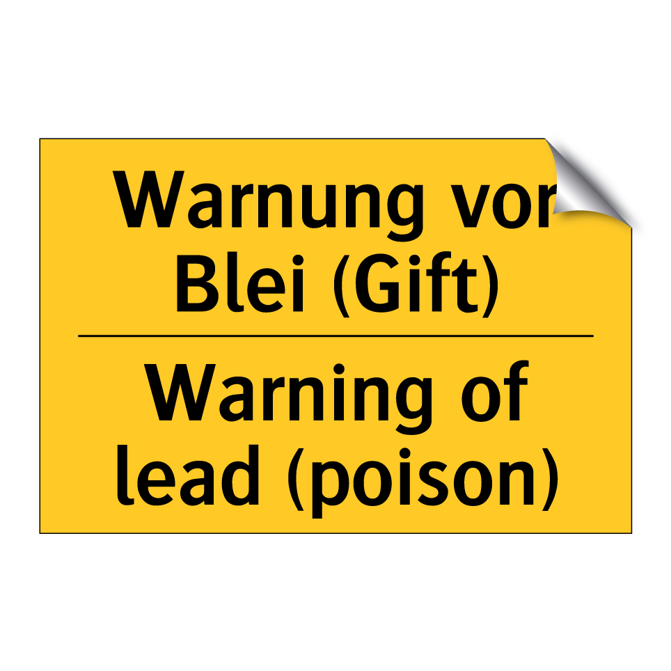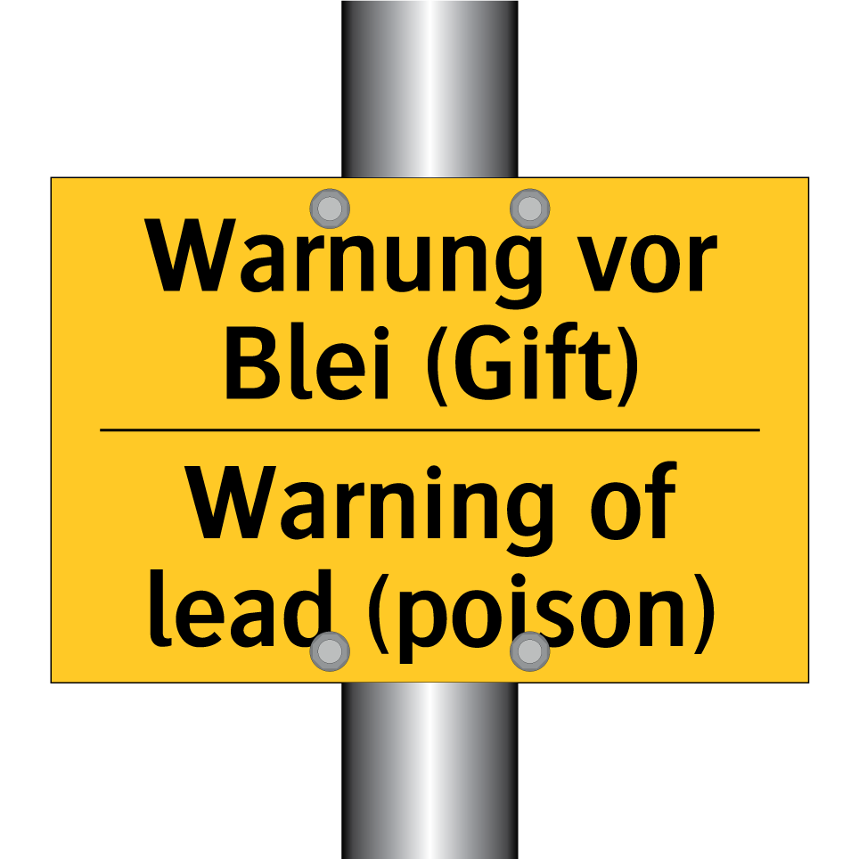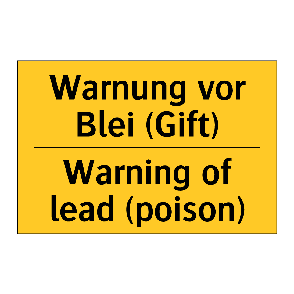 Zweisprachiges Warnschild mit deutschem Text Warnung vor Blei (Gift) und englischem Text Warning of lead (poison)