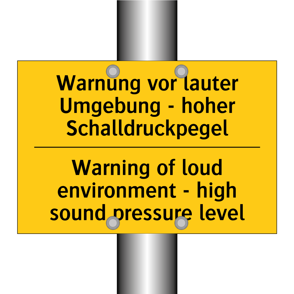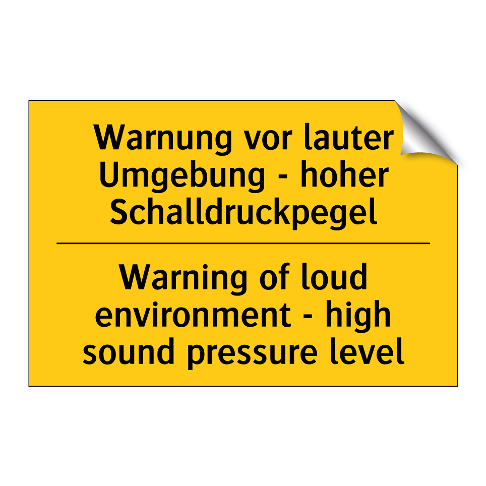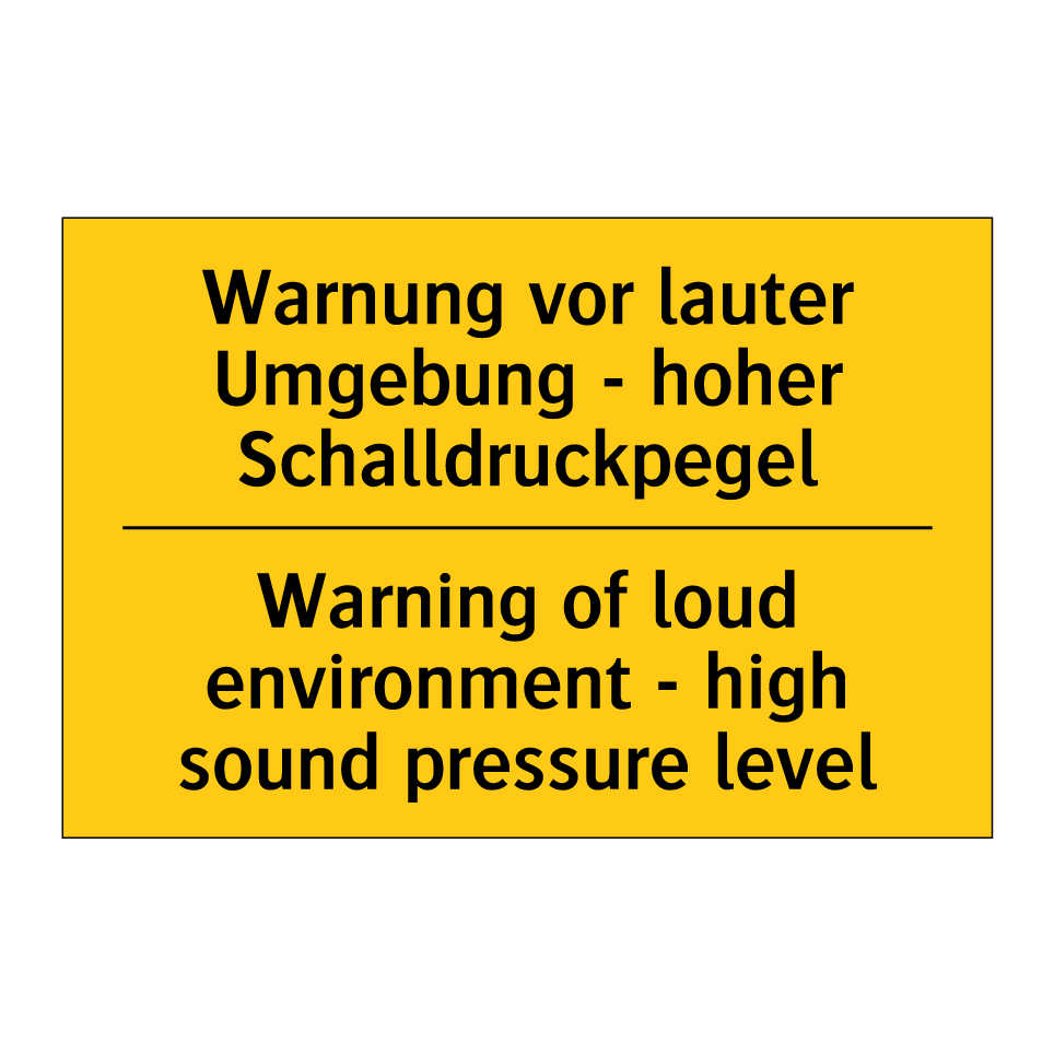 Zweisprachiges Warnschild mit deutschem Text Warnung vor lauter Umgebung - hoher Schalldruckpegel und englischem Text Warning of loud environment - high sound pressure level