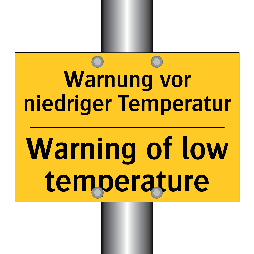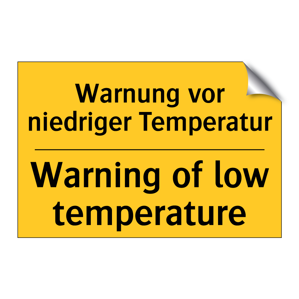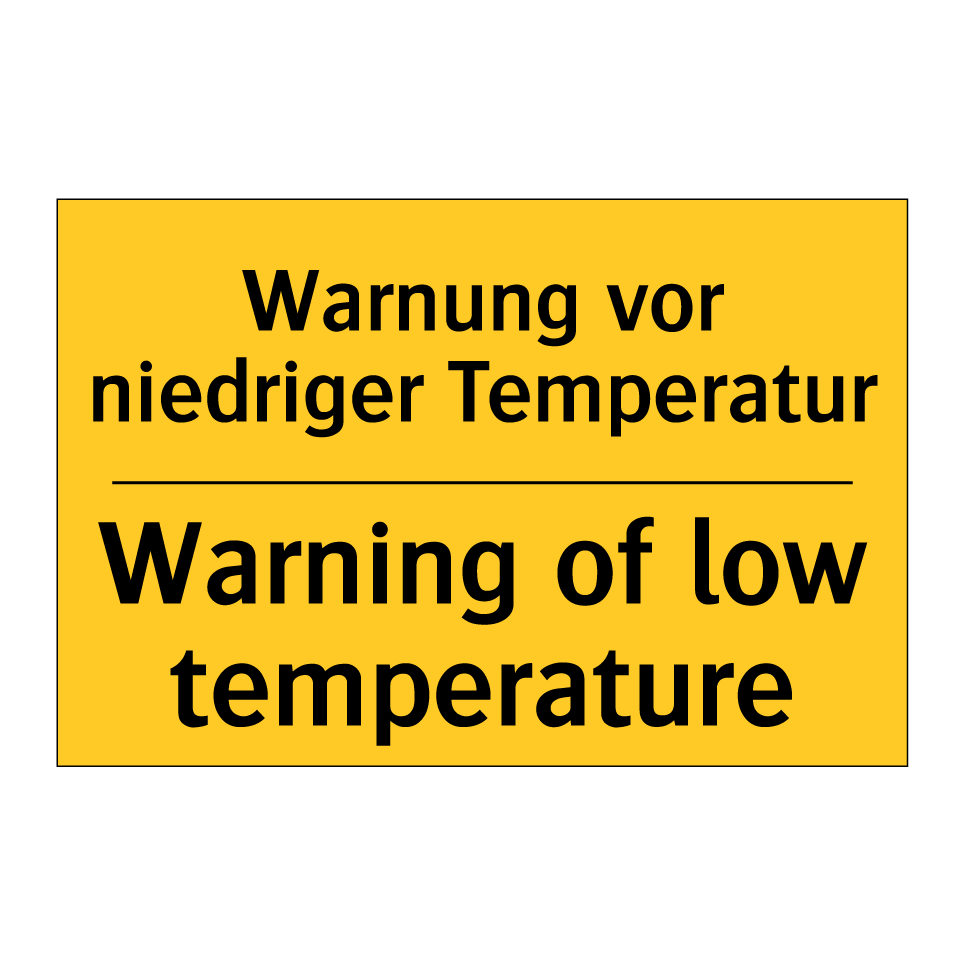 Zweisprachiges Warnschild mit deutschem Text Warnung vor niedriger Temperatur und englischem Text Warning of low temperature