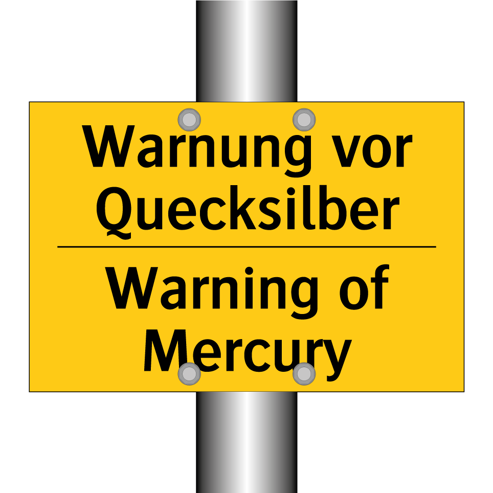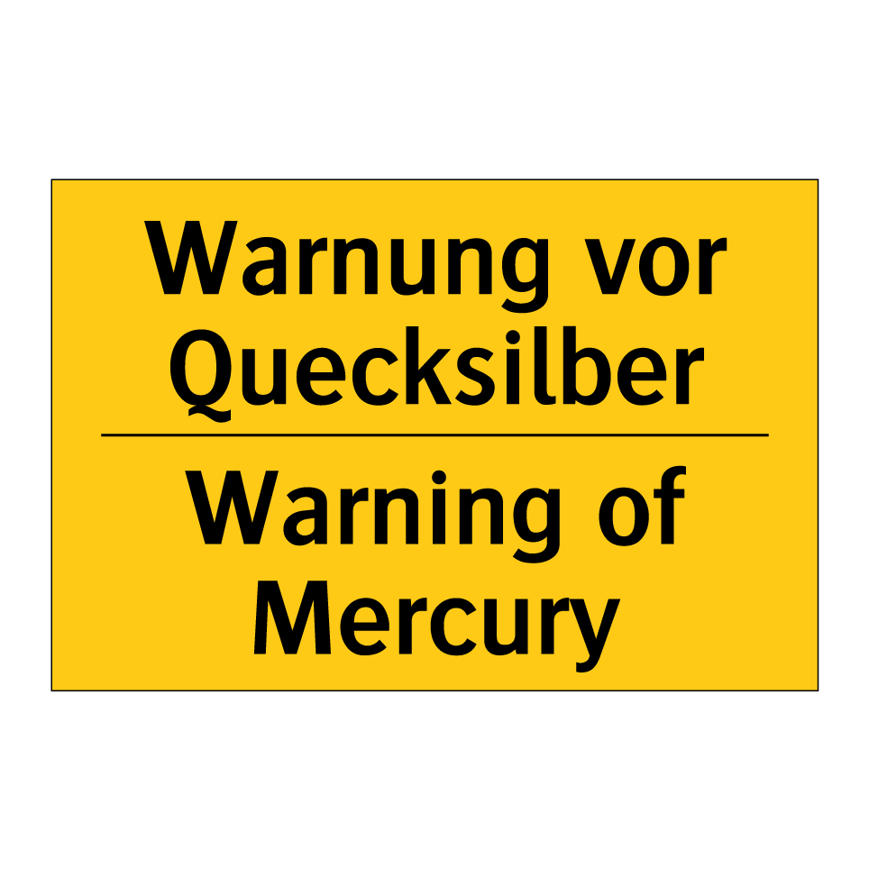 Zweisprachiges Warnschild mit deutschem Text Warnung vor Quecksilber und englischem Text Warning of Mercury