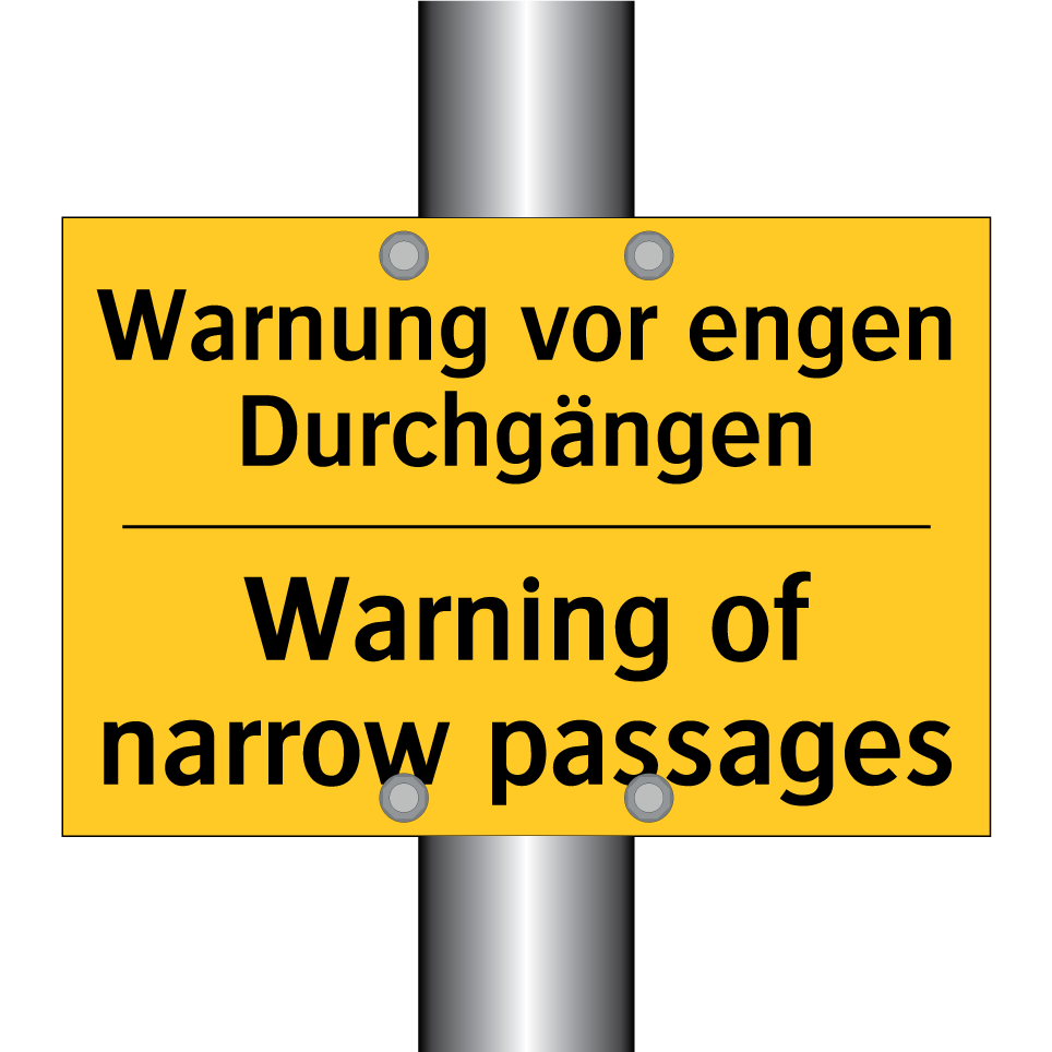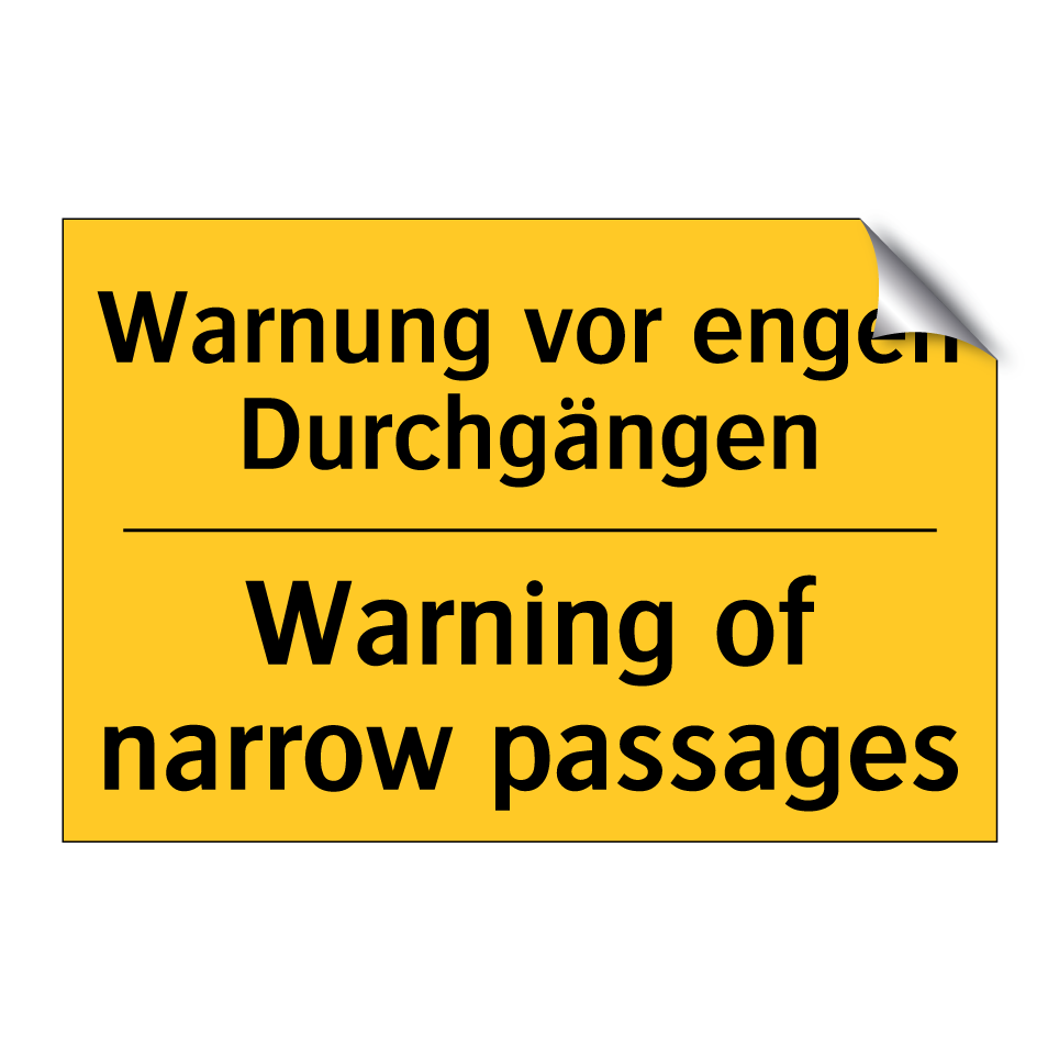 Zweisprachiges Warnschild mit deutschem Text Warnung vor engen Durchgängen und englischem Text Warning of narrow passages