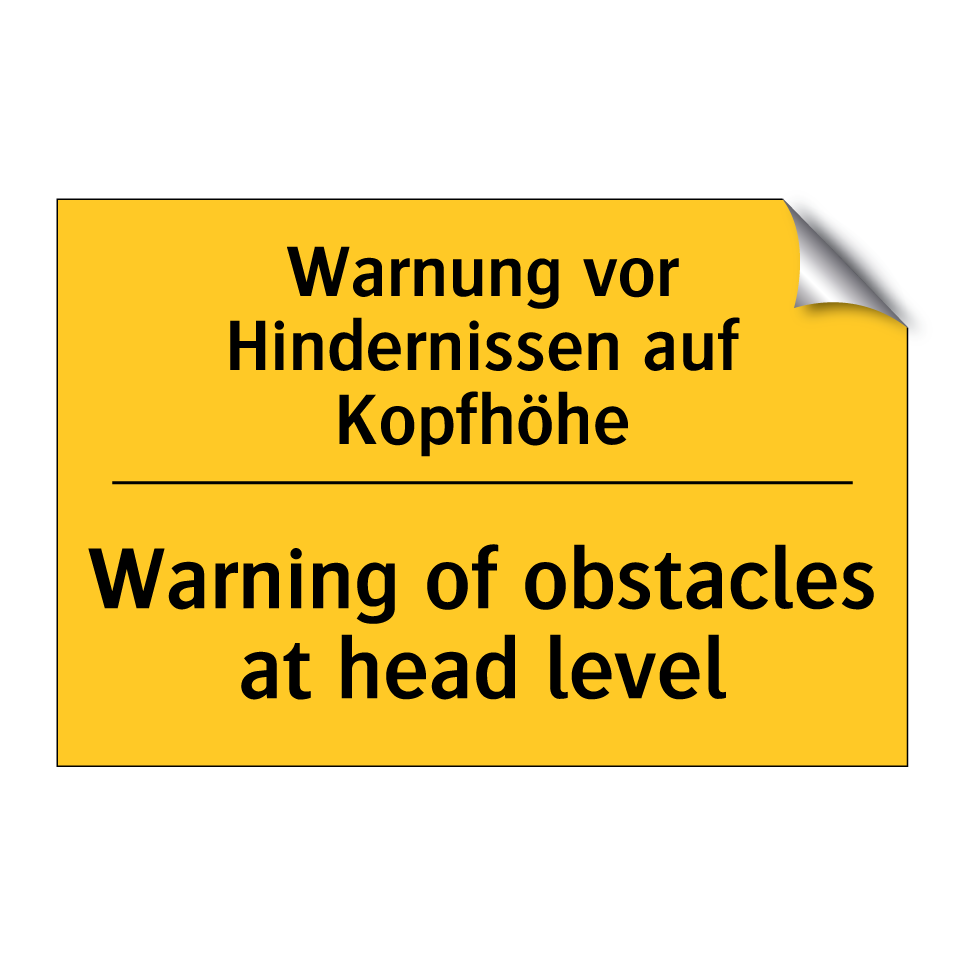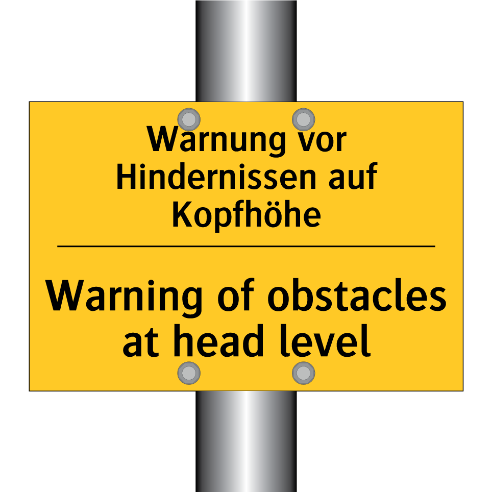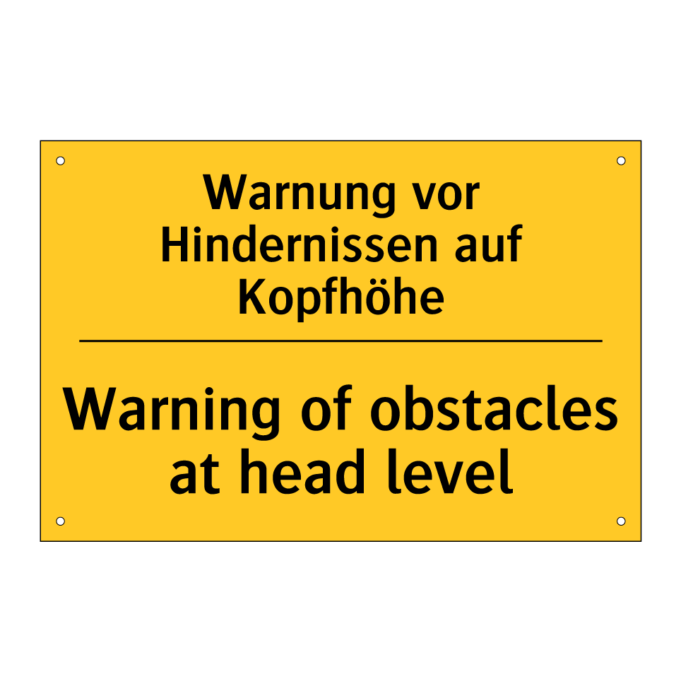 Zweisprachiges Warnschild mit deutschem Text Warnung vor Hindernissen auf Kopfhöhe und englischem Text Warning of obstacles at head level