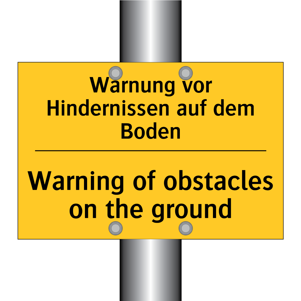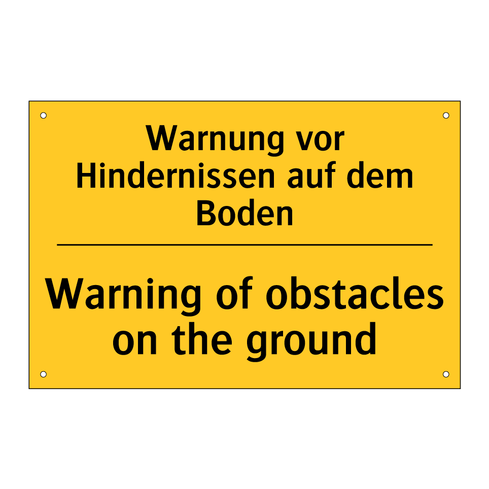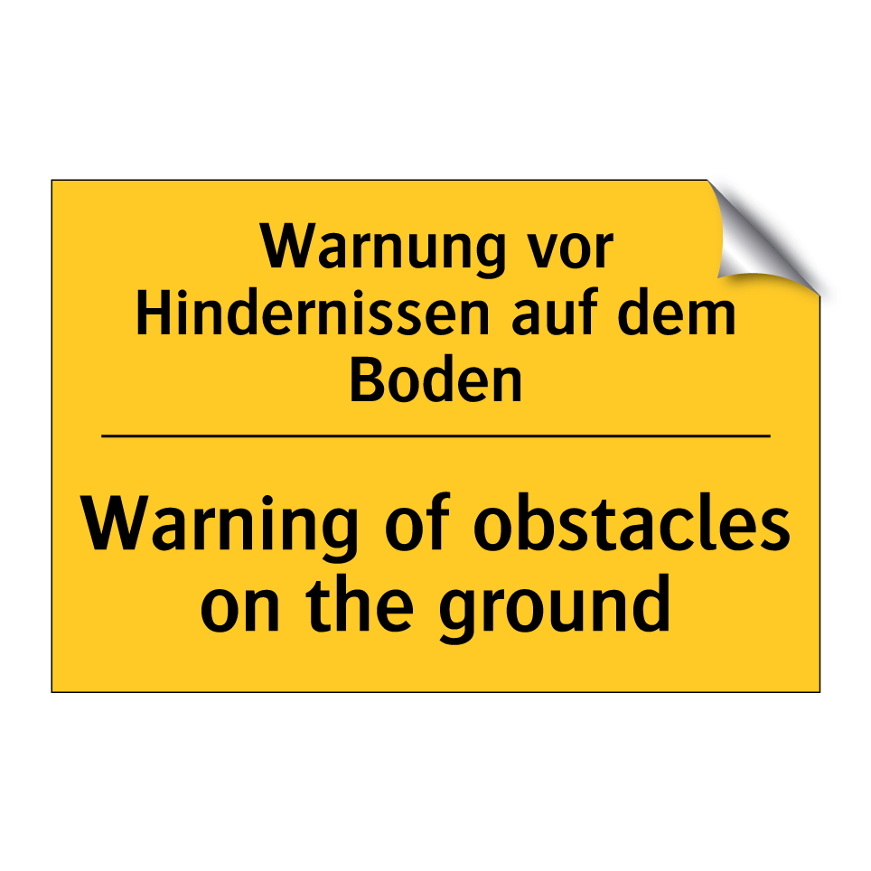 Zweisprachiges Warnschild mit deutschem Text Warnung vor Hindernissen auf dem Boden und englischem Text Warning of obstacles on the ground