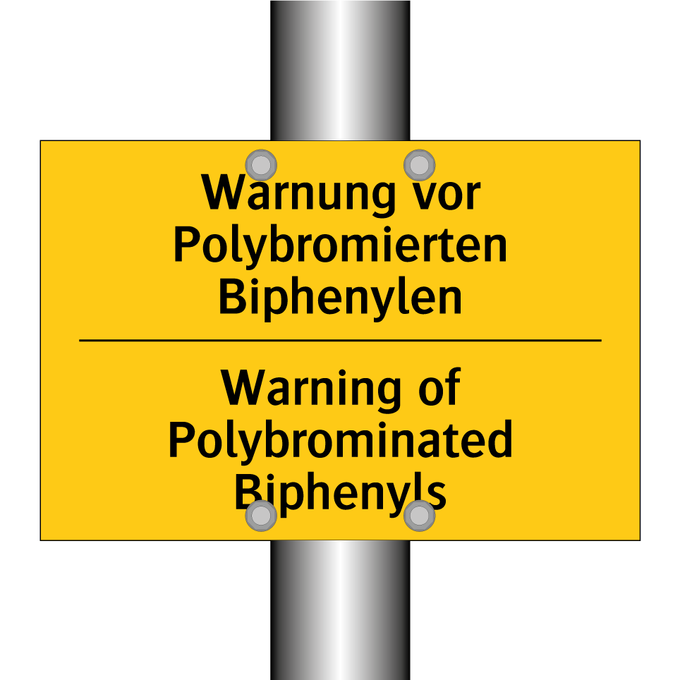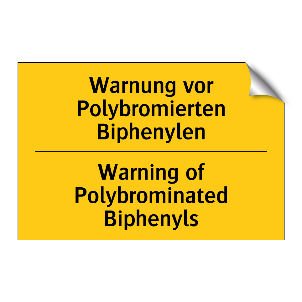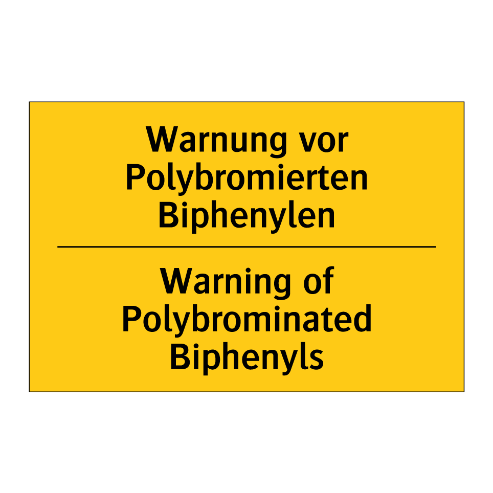 Zweisprachiges Warnschild mit deutschem Text Warnung vor Polybromierten Biphenylen und englischem Text Warning of Polybrominated Biphenyls