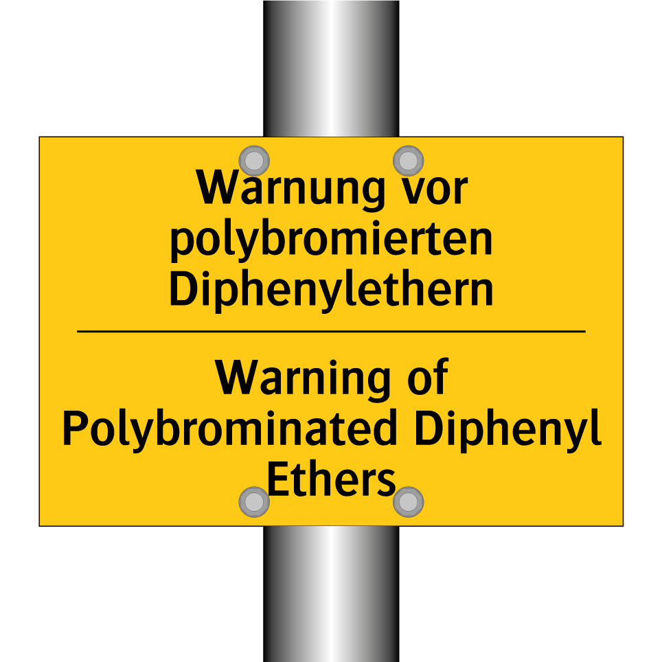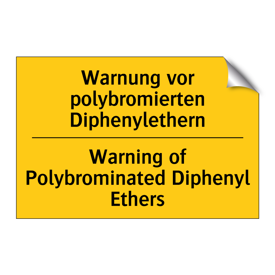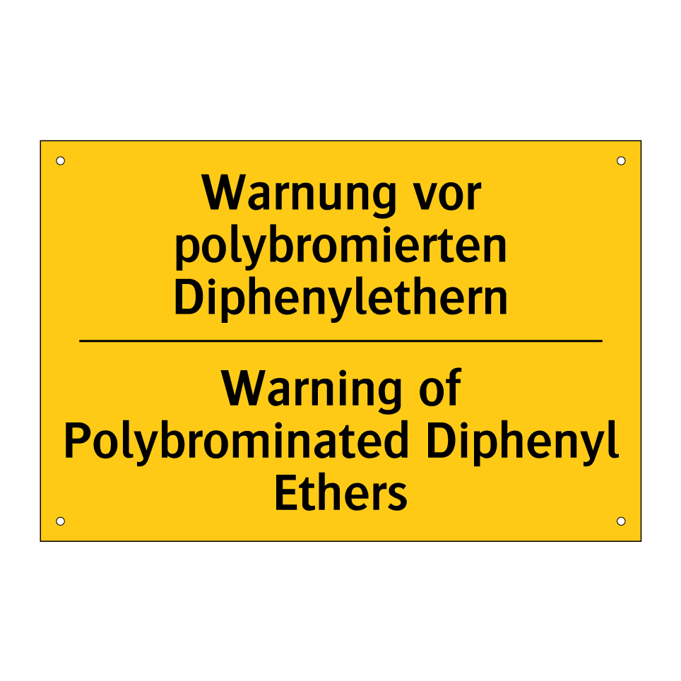 Zweisprachiges Warnschild mit deutschem Text Warnung vor polybromierten Diphenylethern und englischem Text Warning of Polybrominated Diphenyl Ethers
