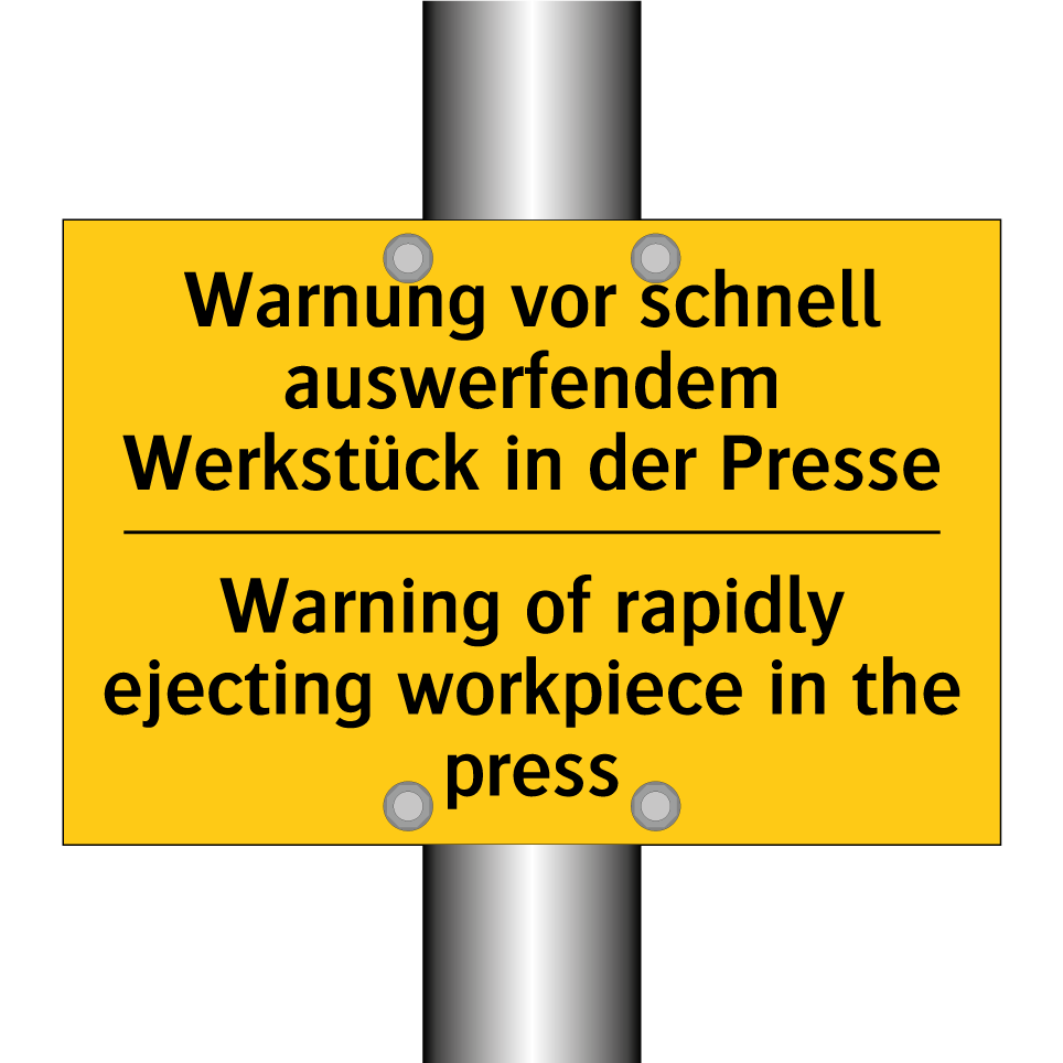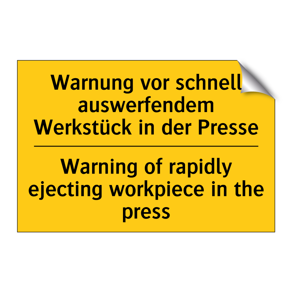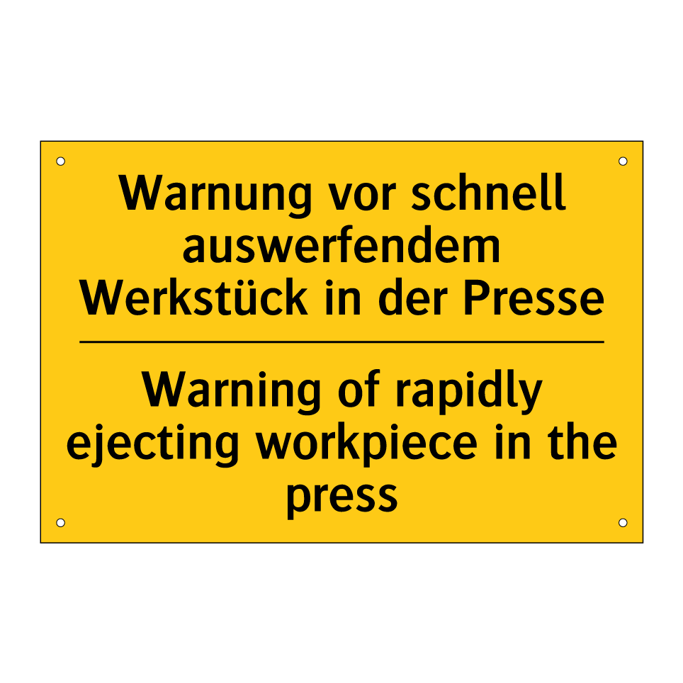 Zweisprachiges Warnschild mit deutschem Text Warnung vor schnell auswerfendem Werkstück in der Presse und englischem Text Warning of rapidly ejecting workpiece in the press