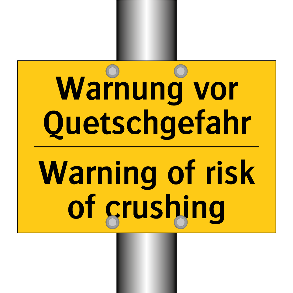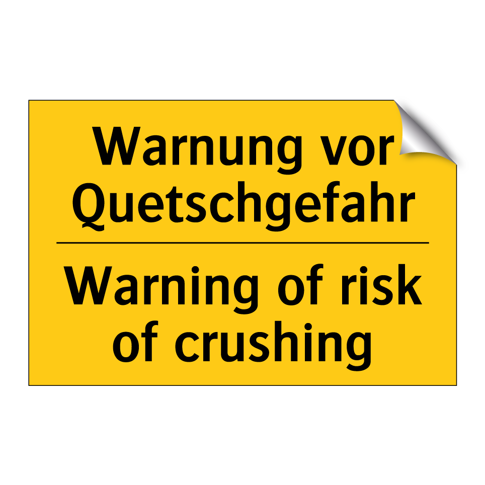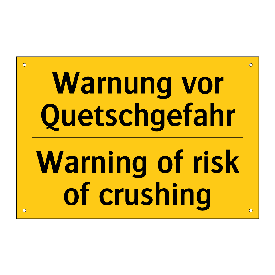 Zweisprachiges Warnschild mit deutschem Text Warnung vor Quetschgefahr und englischem Text Warning of risk of crushing