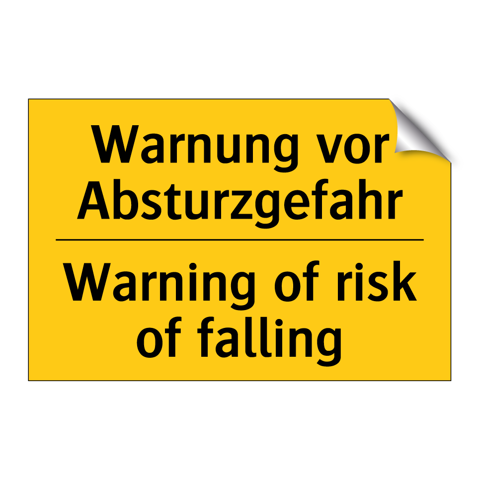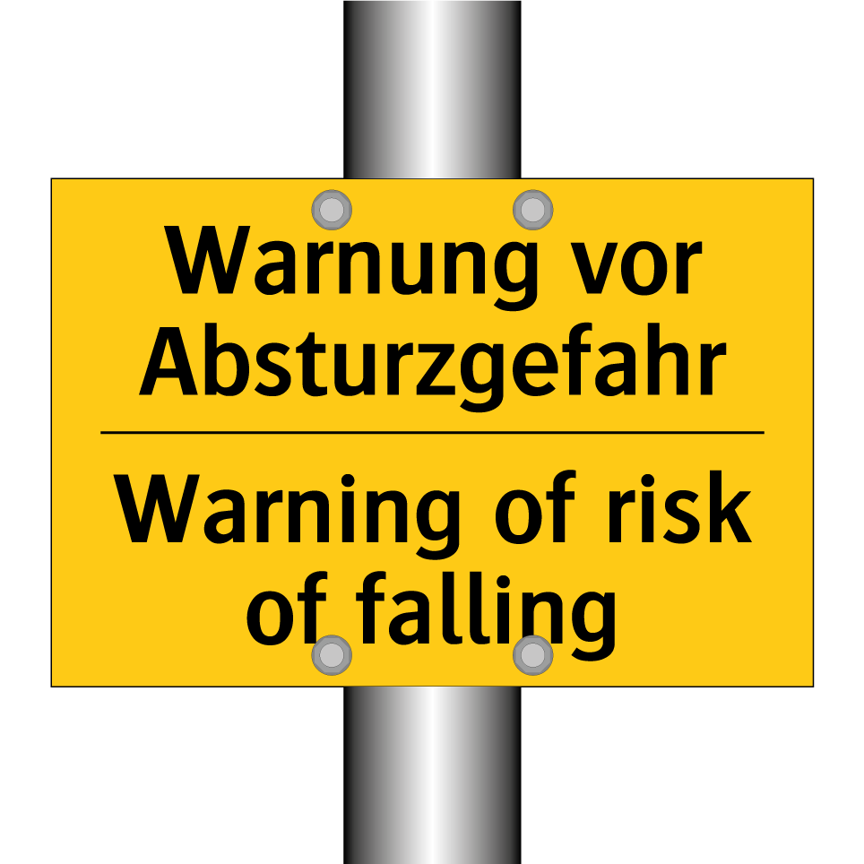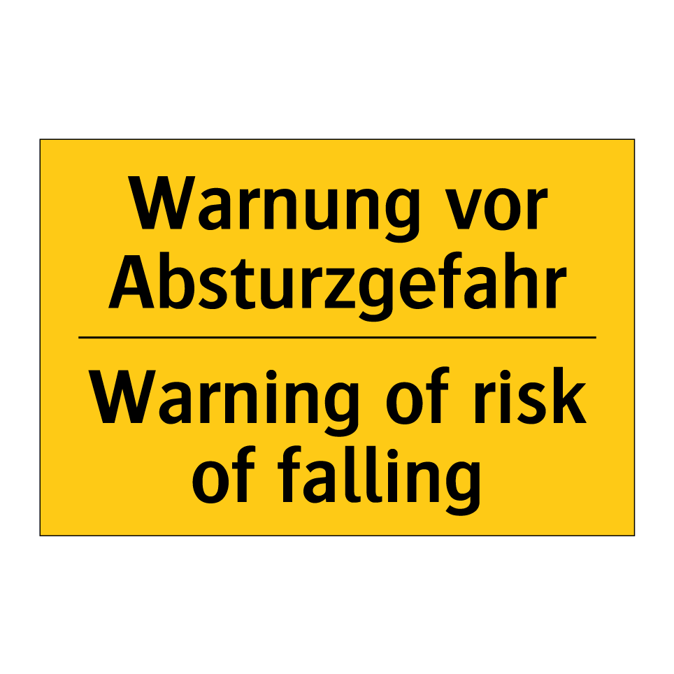 Zweisprachiges Warnschild mit deutschem Text Warnung vor Absturzgefahr und englischem Text Warning of risk of falling