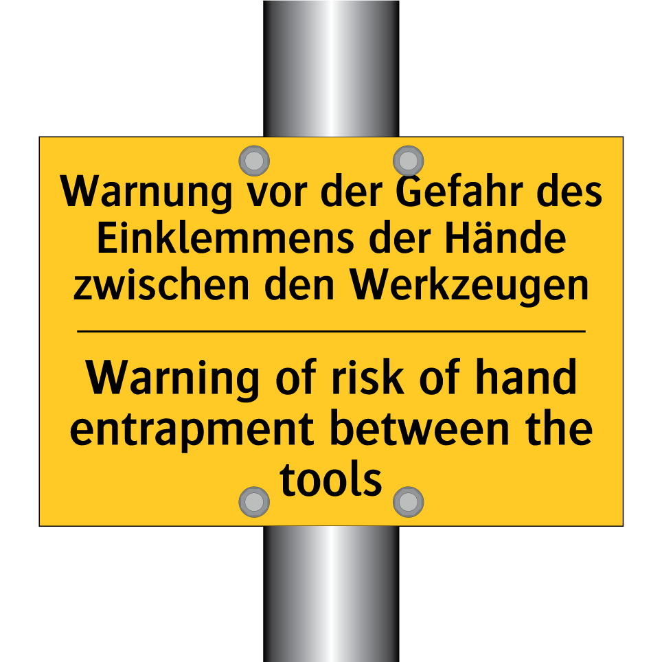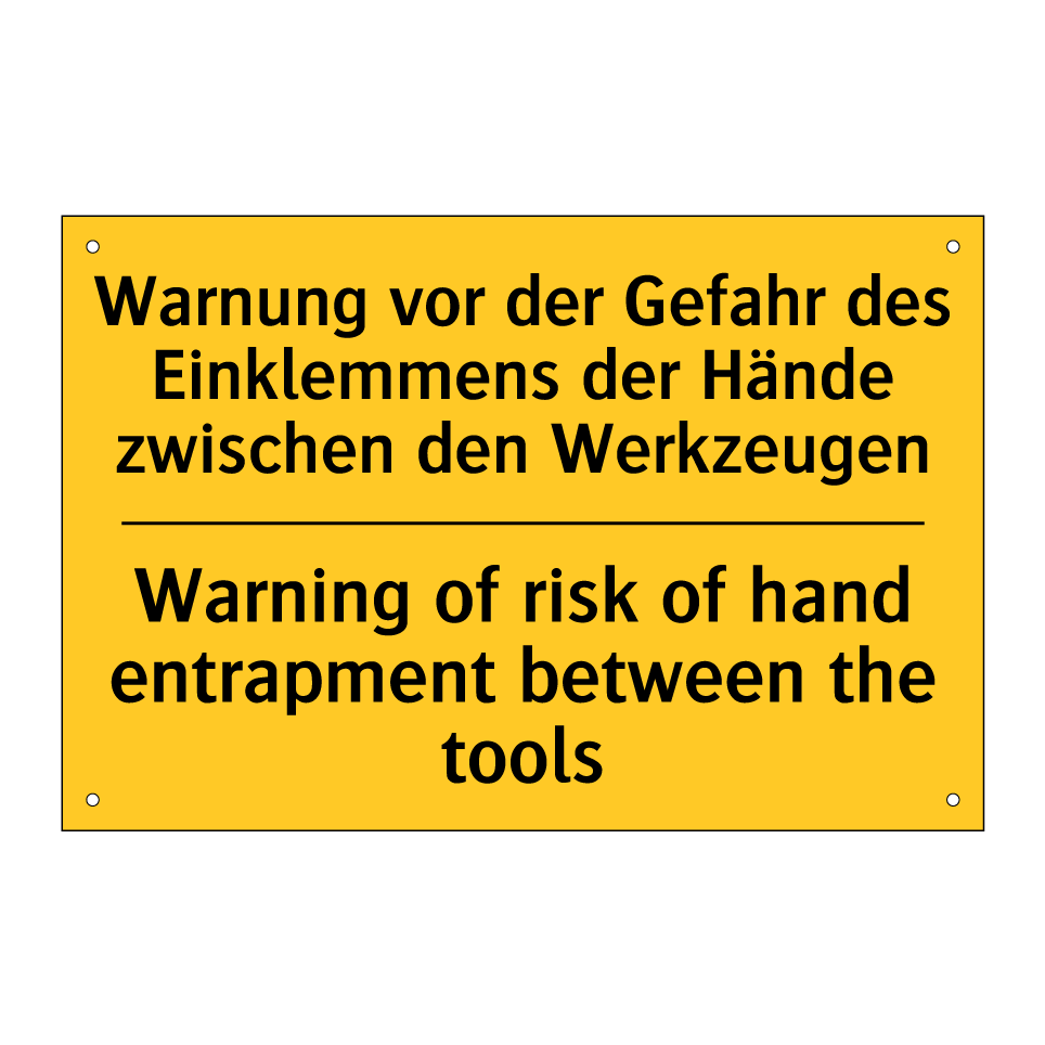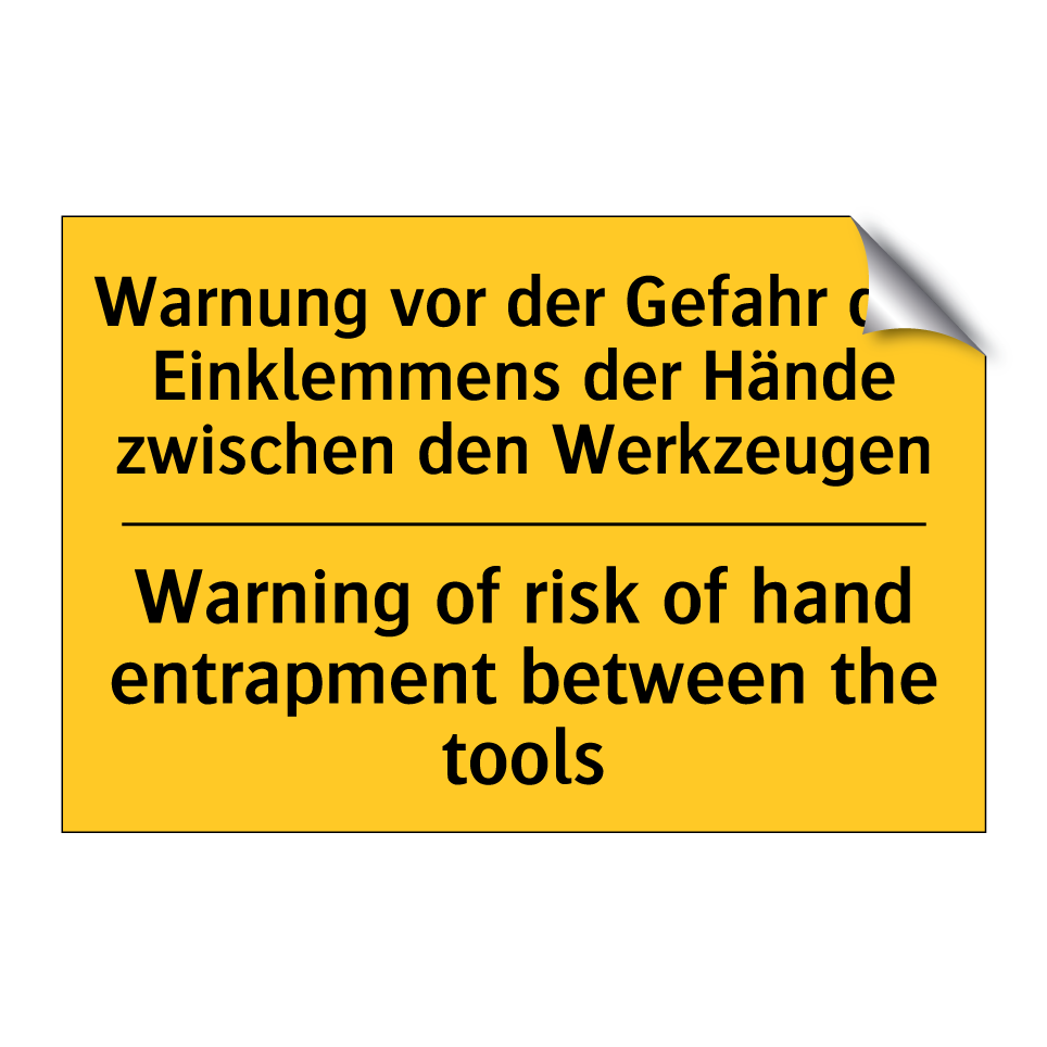 Zweisprachiges Warnschild mit deutschem Text Warnung vor der Gefahr des Einklemmens der Hände zwischen den Werkzeugen und englischem Text Warning of risk of hand entrapment between the tools