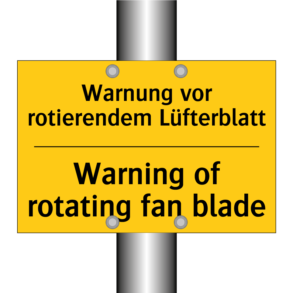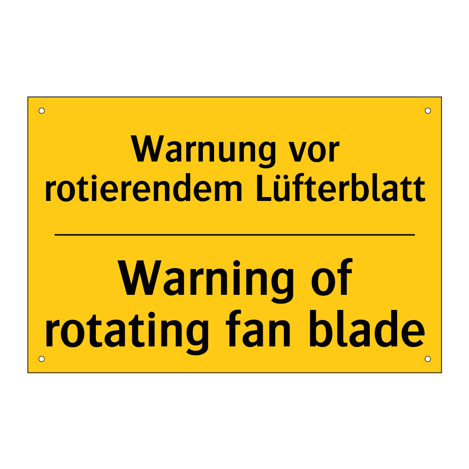 Zweisprachiges Warnschild mit deutschem Text Warnung vor rotierendem Lüfterblatt und englischem Text Warning of rotating fan blade