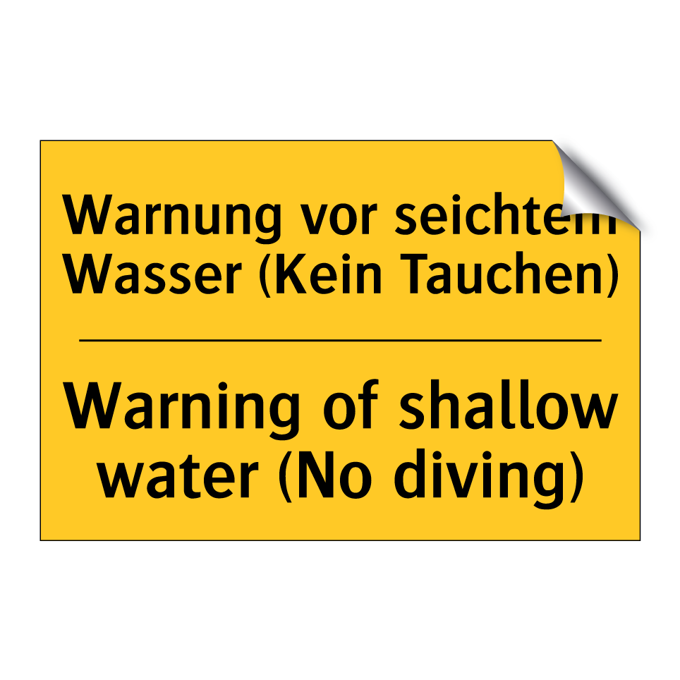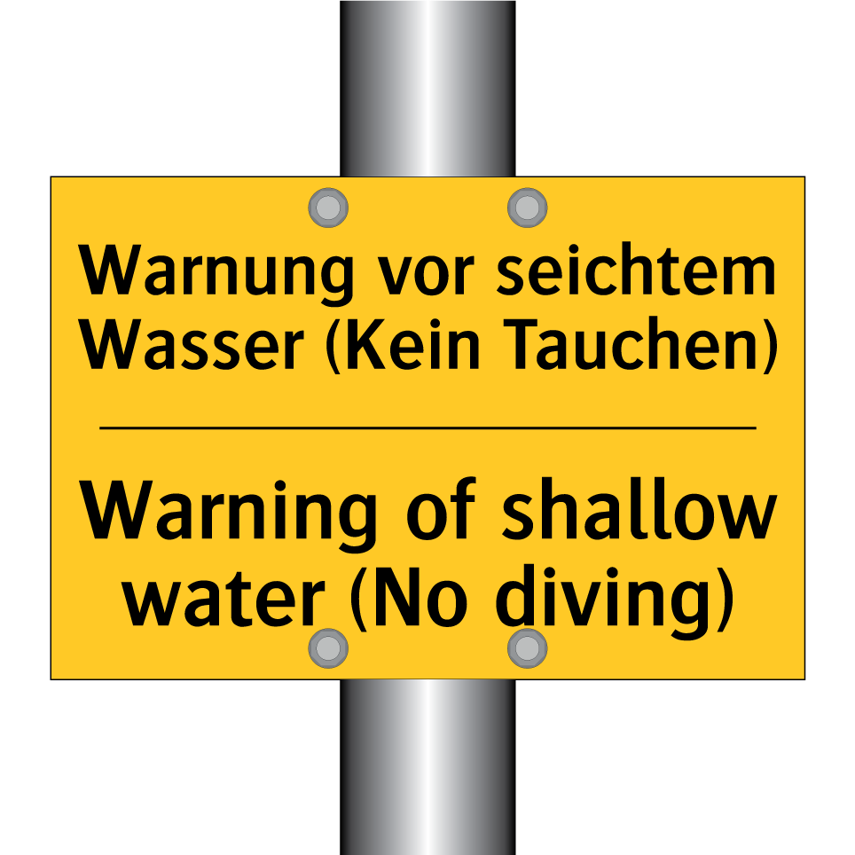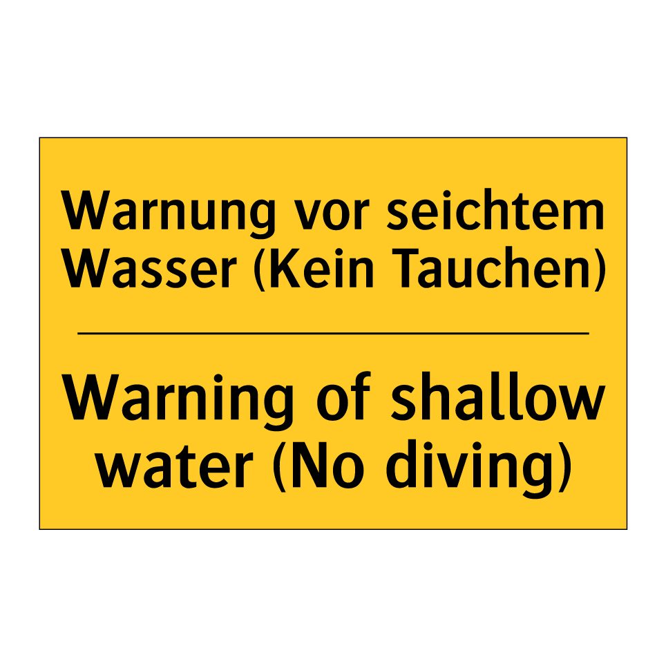Zweisprachiges Warnschild mit deutschem Text Warnung vor seichtem Wasser (Kein Tauchen) und englischem Text Warning of shallow water (No diving)