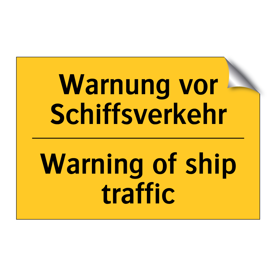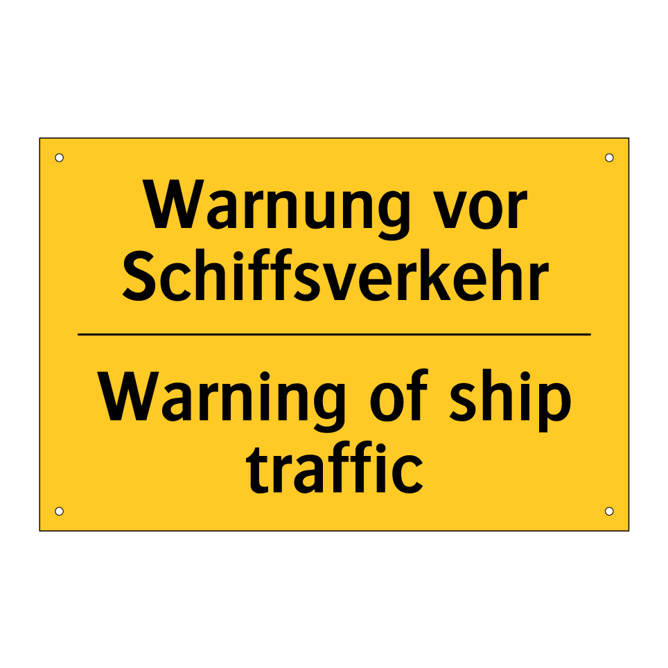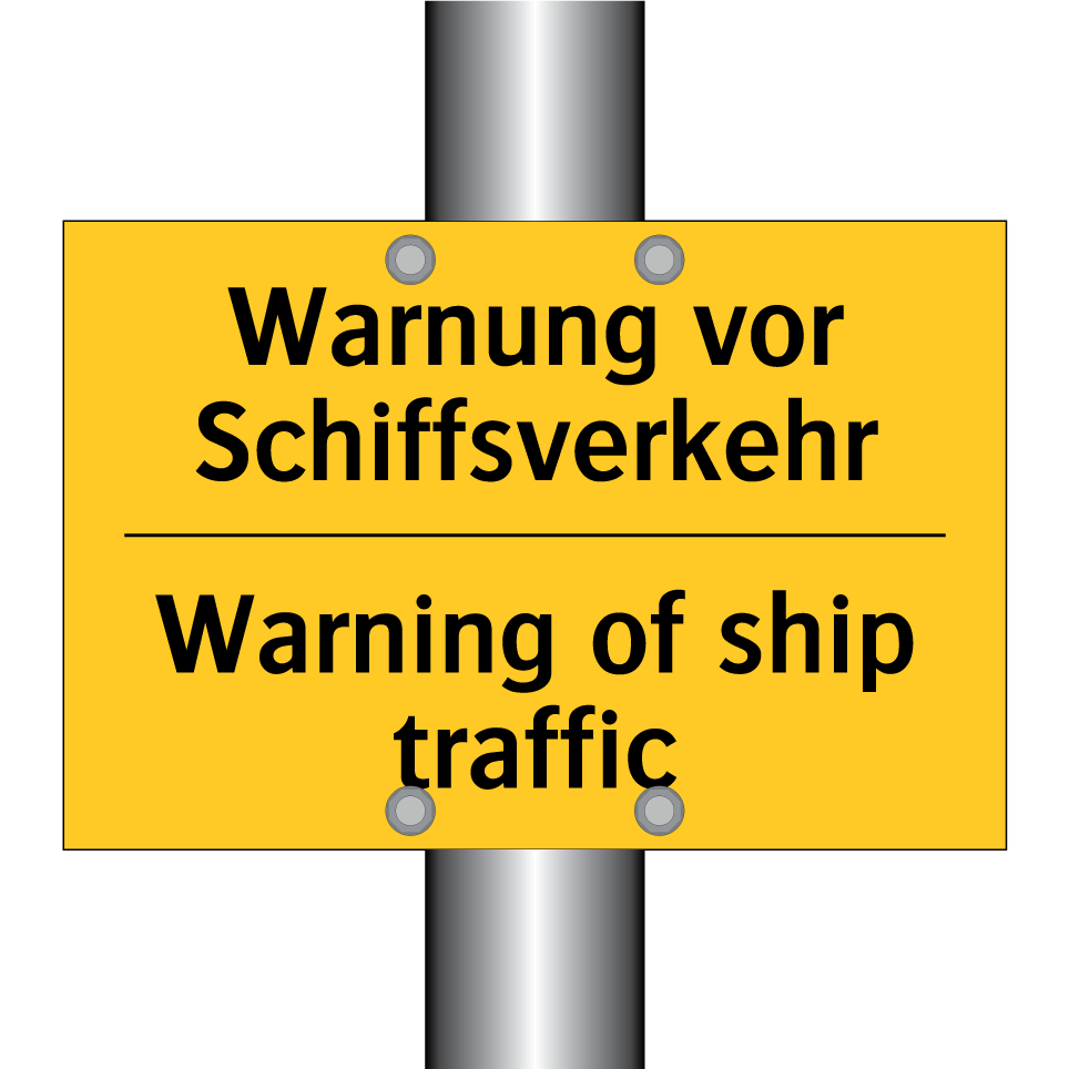 Zweisprachiges Warnschild mit deutschem Text Warnung vor Schiffsverkehr und englischem Text Warning of ship traffic