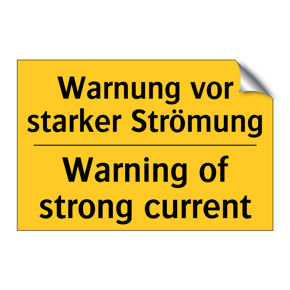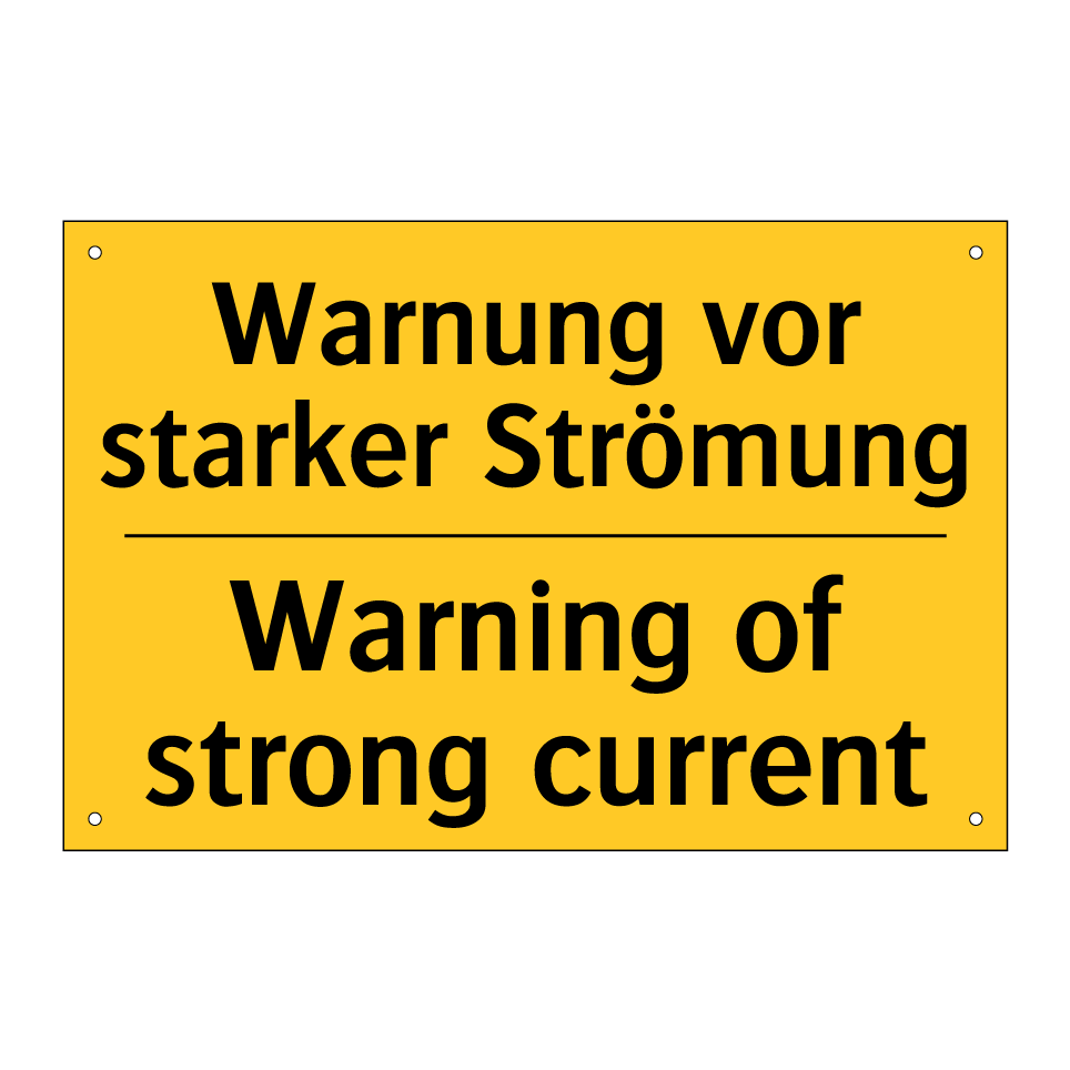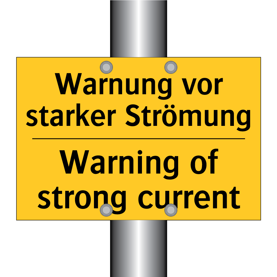 Zweisprachiges Warnschild mit deutschem Text Warnung vor starker Strömung und englischem Text Warning of strong current