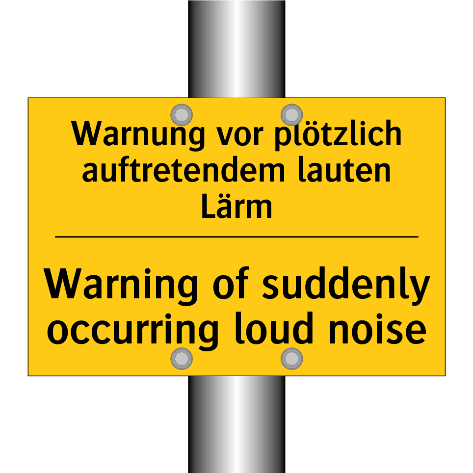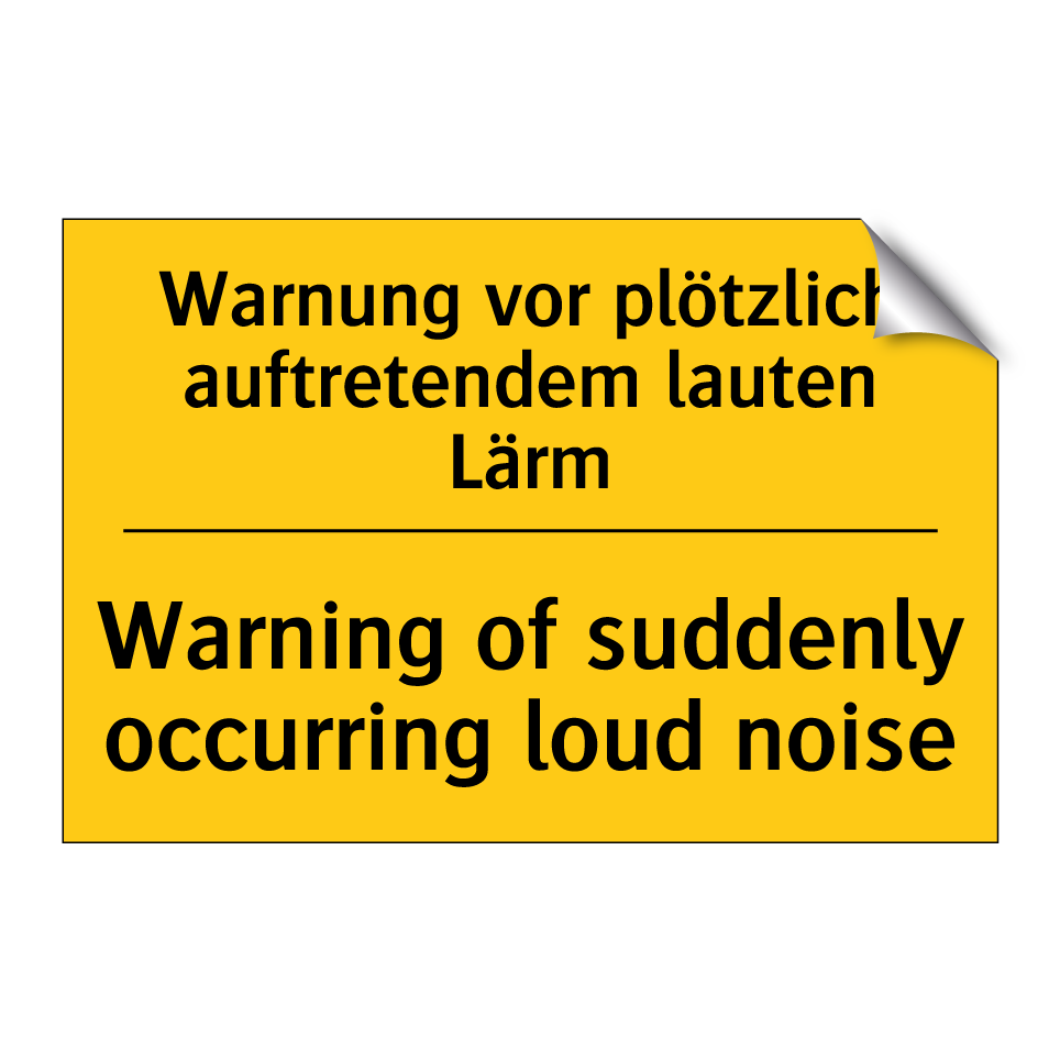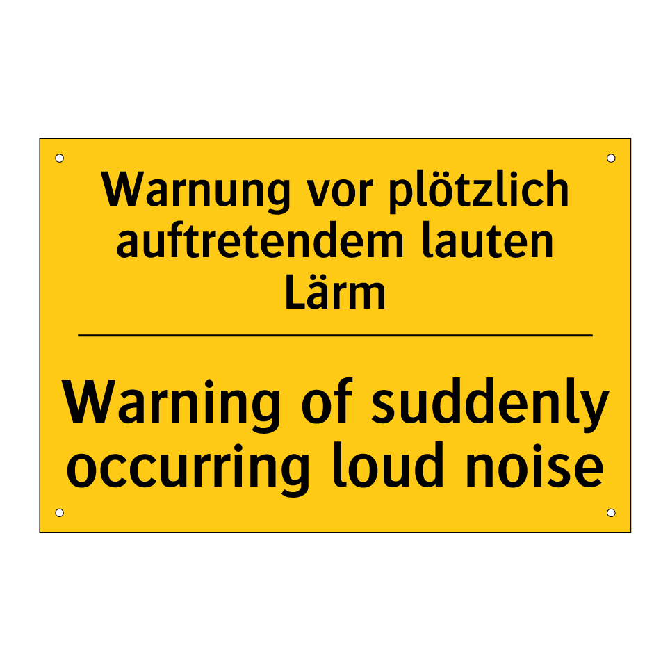 Zweisprachiges Warnschild mit deutschem Text Warnung vor plötzlich auftretendem lauten Lärm und englischem Text Warning of suddenly occurring loud noise
