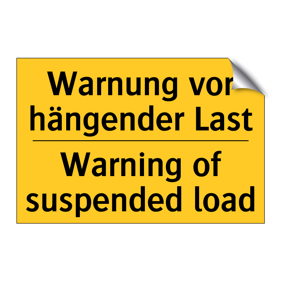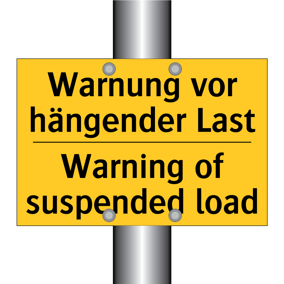 Zweisprachiges Warnschild mit deutschem Text Warnung vor hängender Last und englischem Text Warning of suspended load