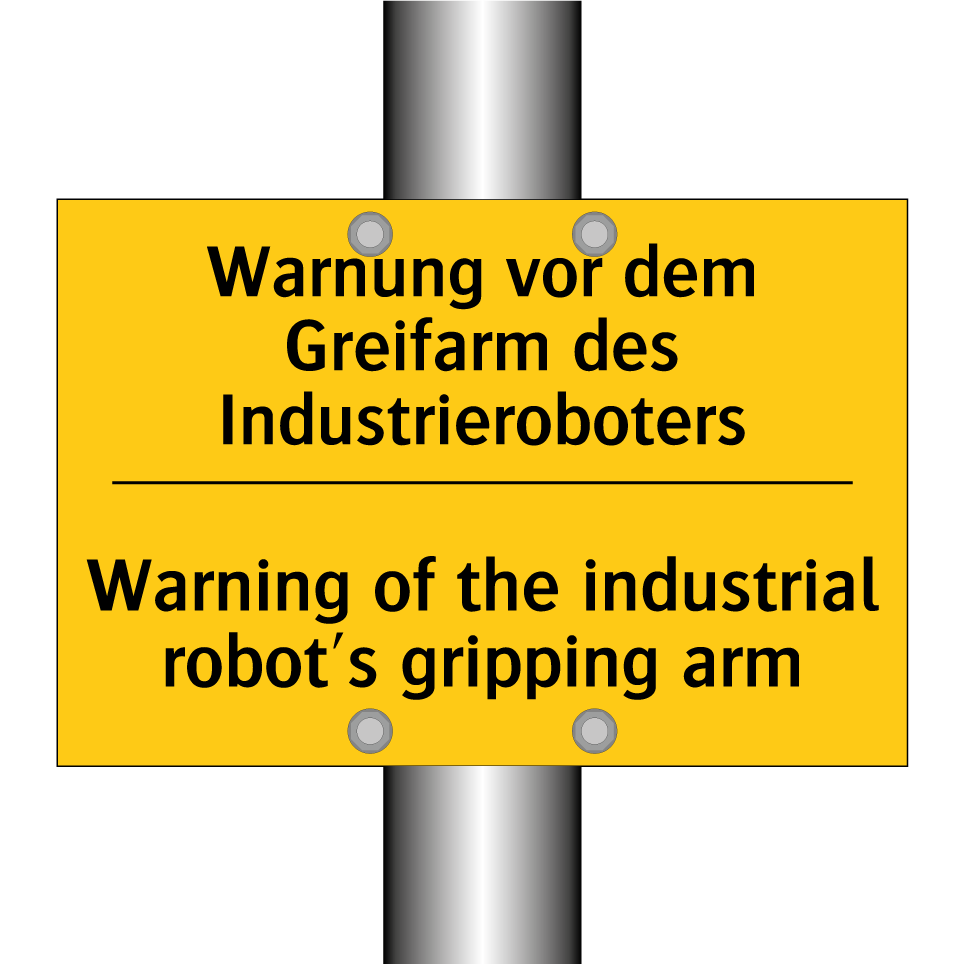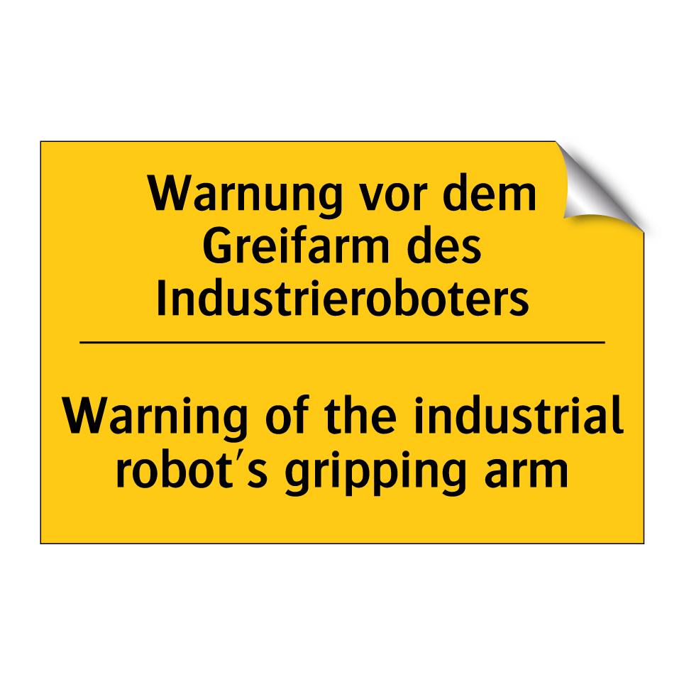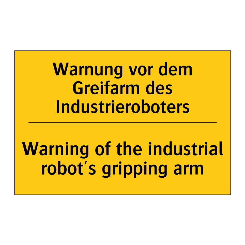 Zweisprachiges Warnschild mit deutschem Text Warnung vor dem Greifarm des Industrieroboters und englischem Text Warning of the industrial robot's gripping arm
