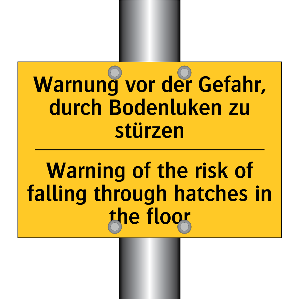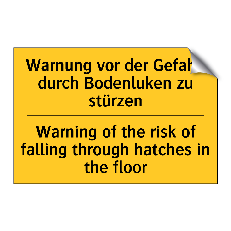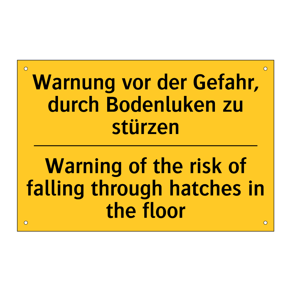 Zweisprachiges Warnschild mit deutschem Text Warnung vor der Gefahr, durch Bodenluken zu stürzen und englischem Text Warning of the risk of falling through hatches in the floor