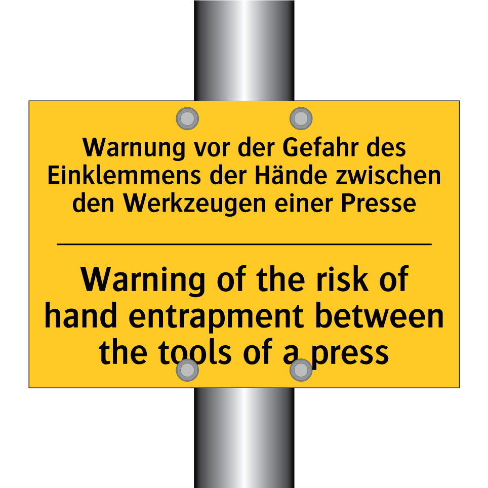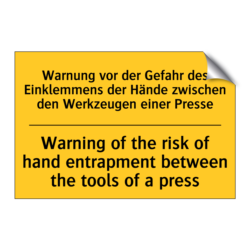 Zweisprachiges Warnschild mit deutschem Text Warnung vor der Gefahr des Einklemmens der Hände zwischen den Werkzeugen einer Presse und englischem Text Warning of the risk of hand entrapment between the tools of a press