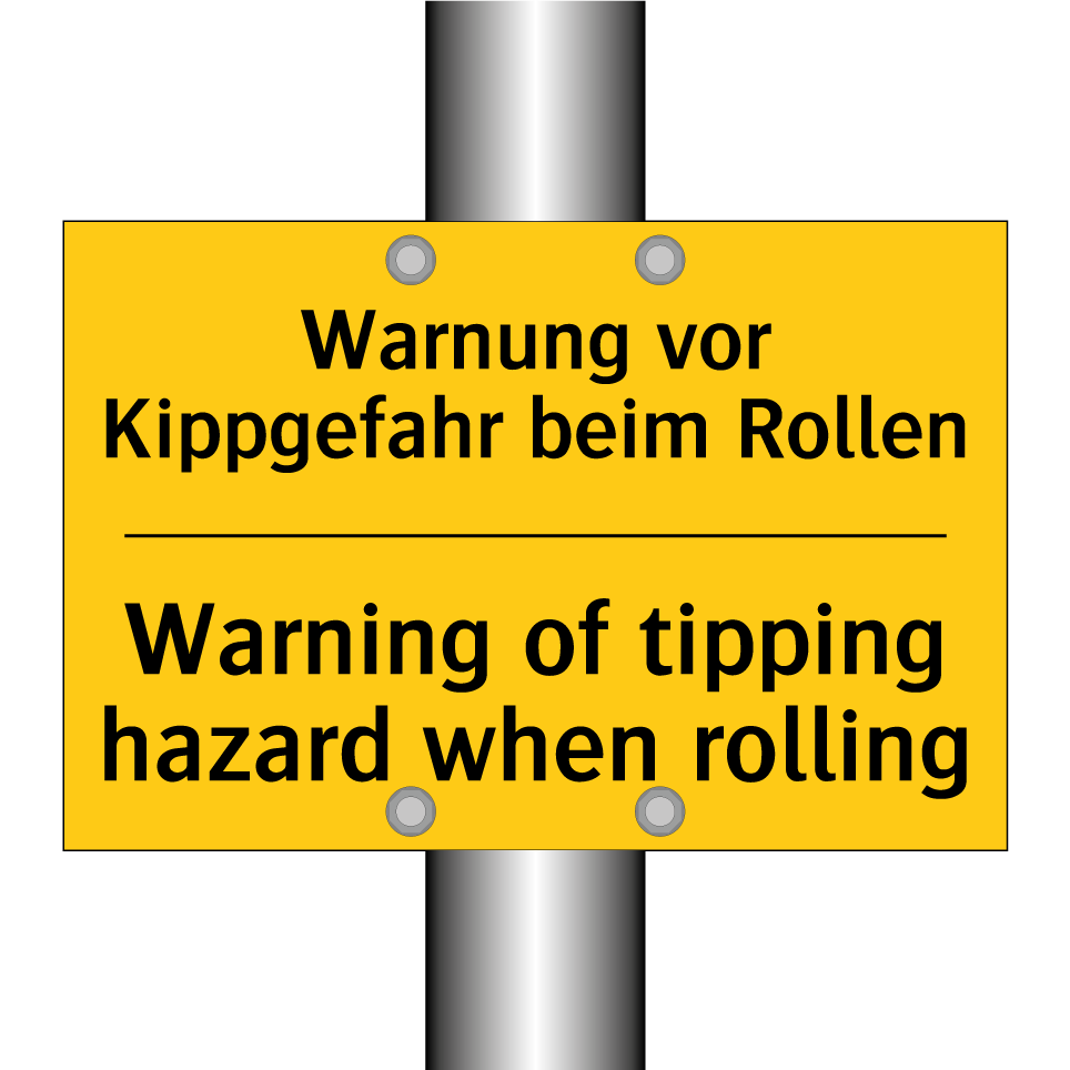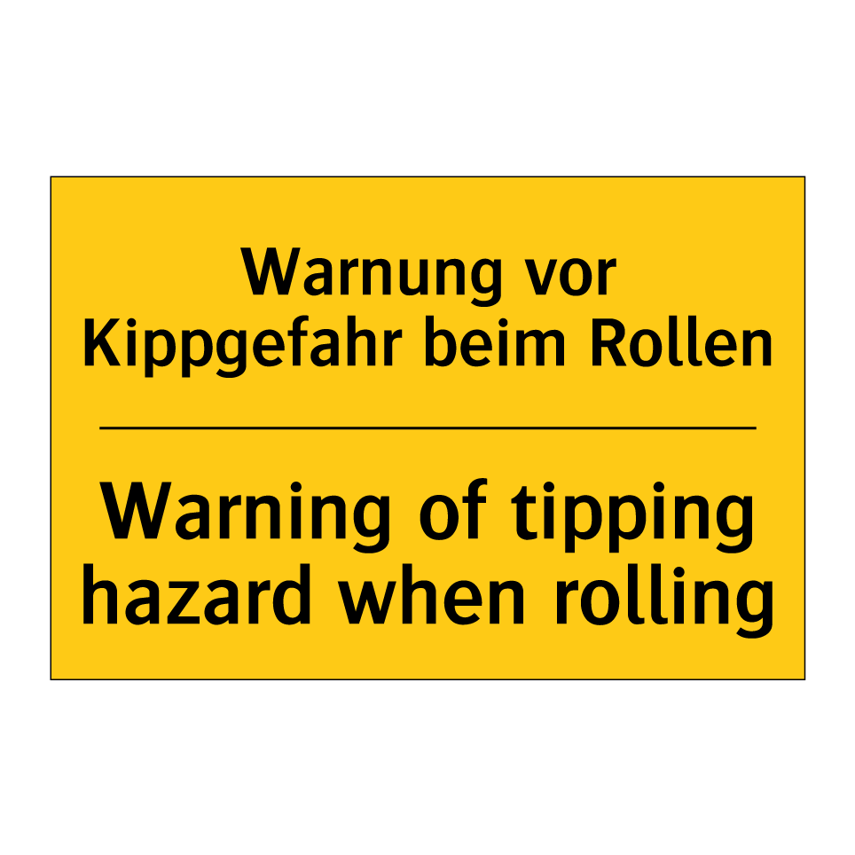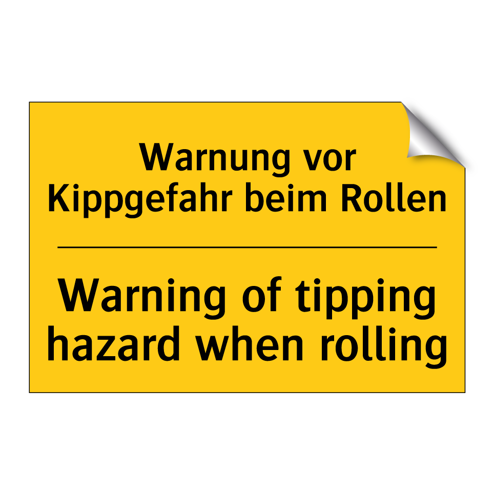 Zweisprachiges Warnschild mit deutschem Text Warnung vor Kippgefahr beim Rollen und englischem Text Warning of tipping hazard when rolling