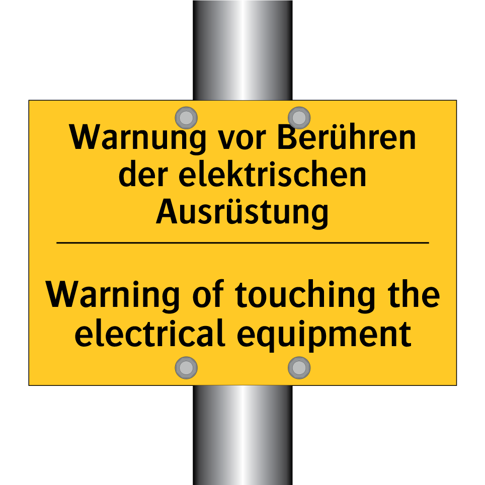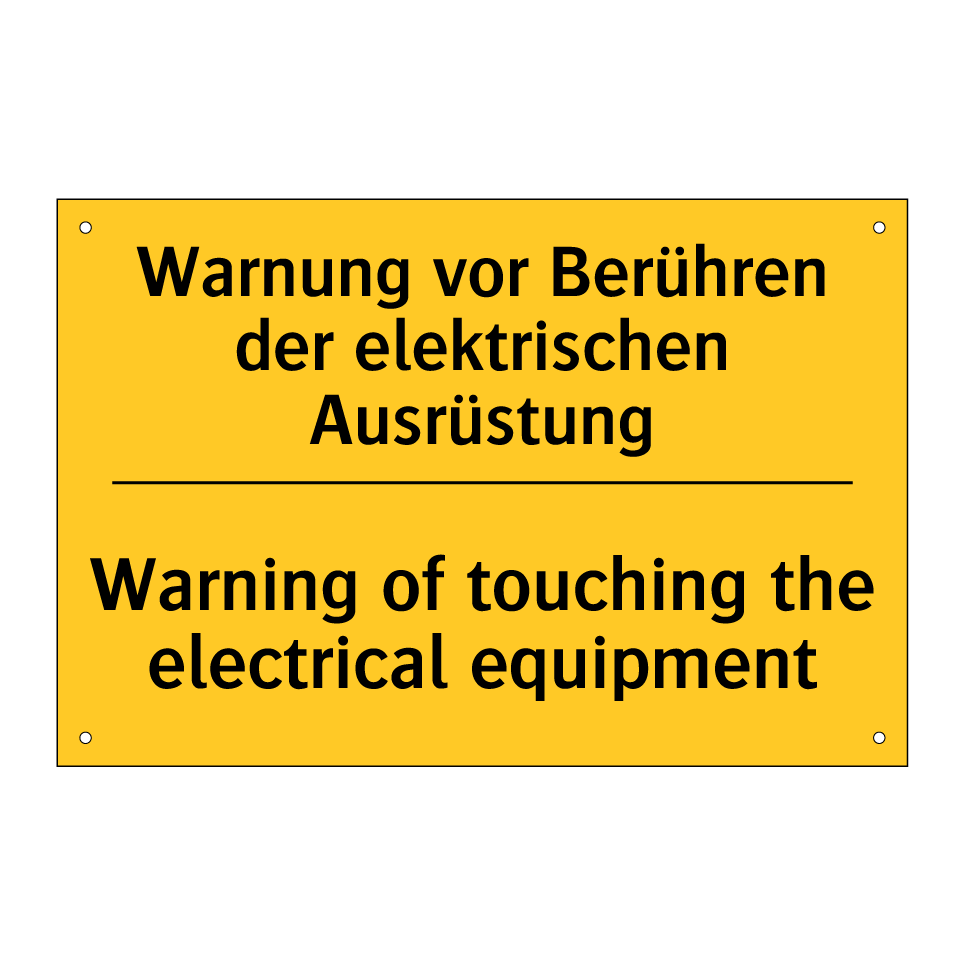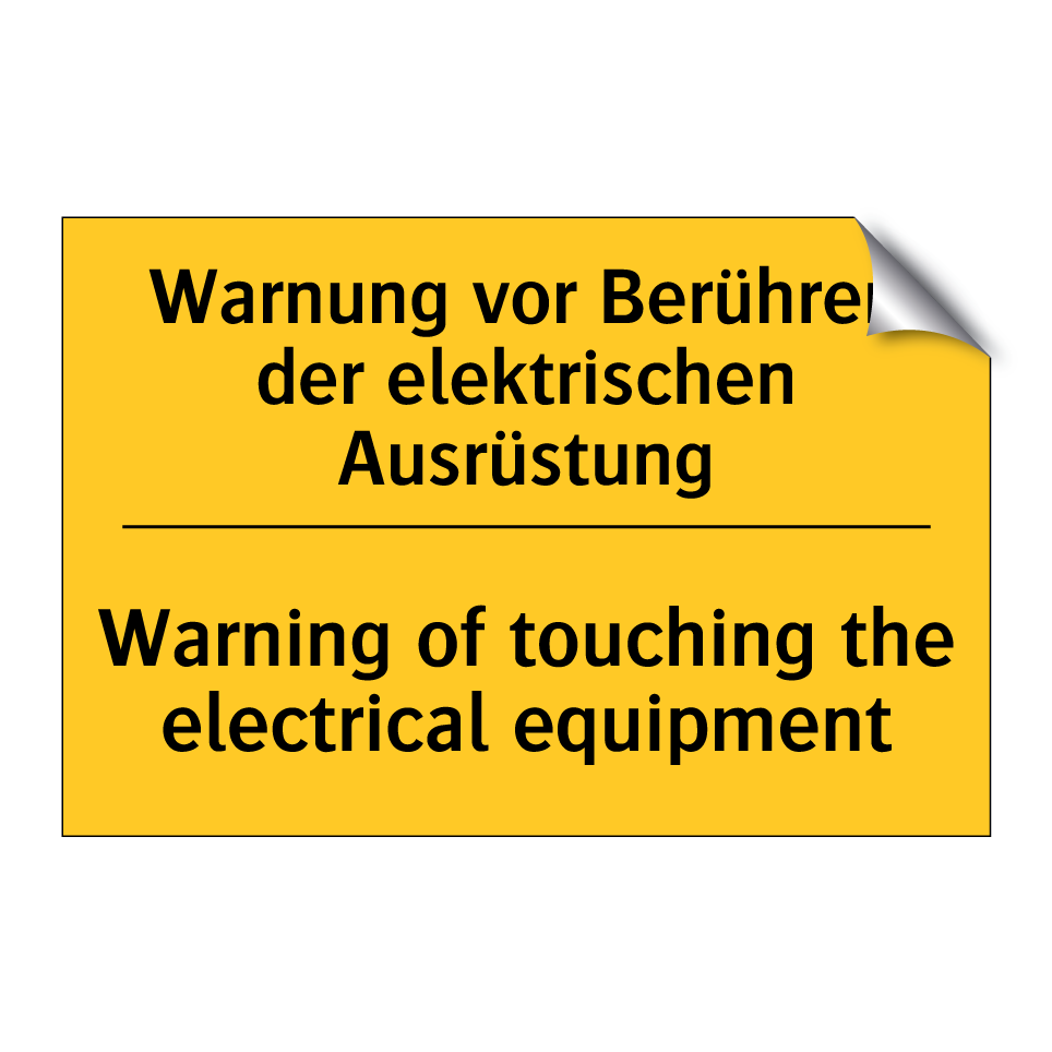 Zweisprachiges Warnschild mit deutschem Text Warnung vor Berühren der elektrischen Ausrüstung und englischem Text Warning of touching the electrical equipment