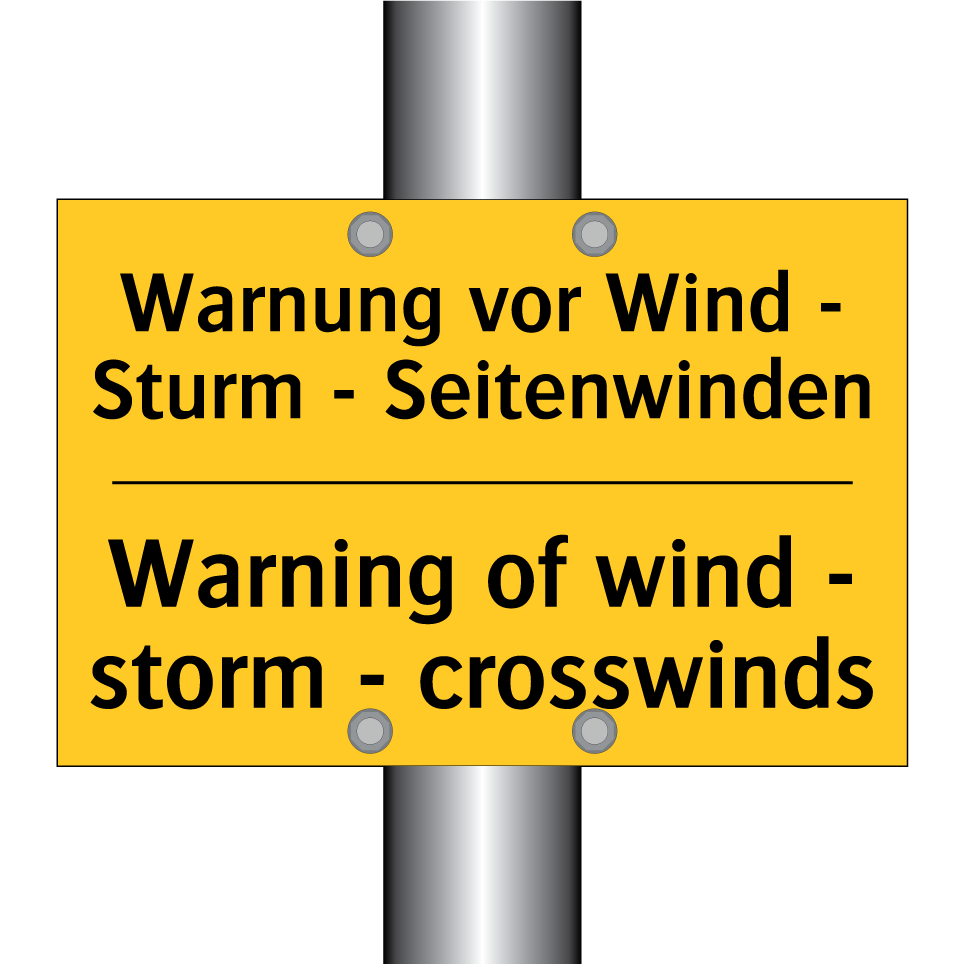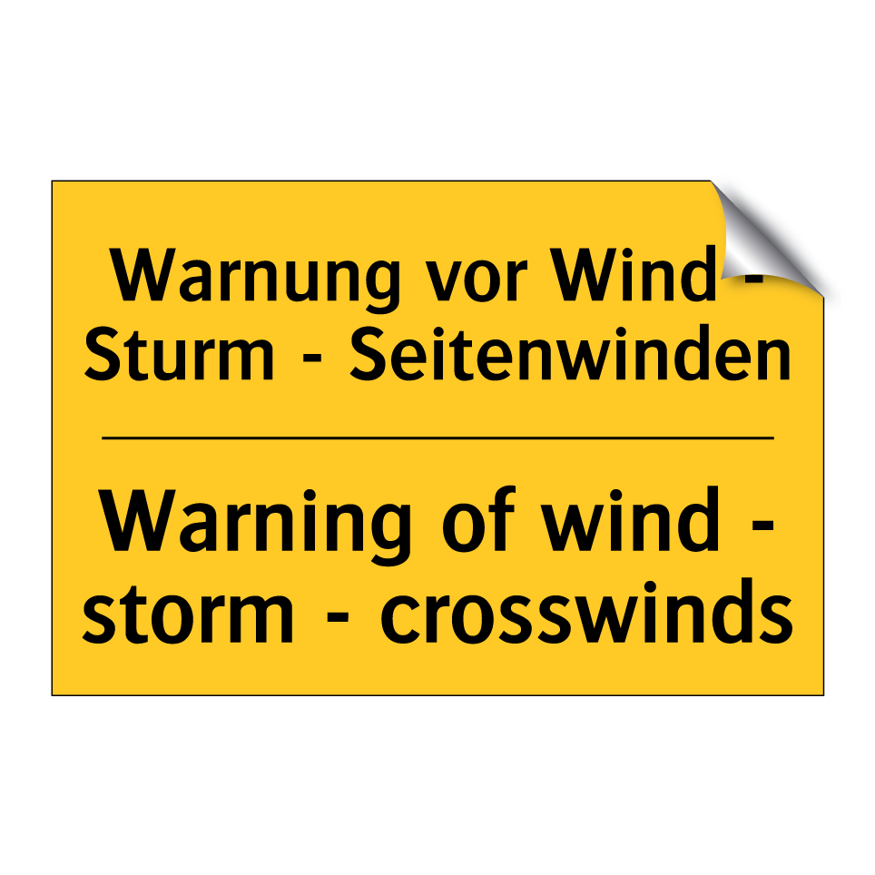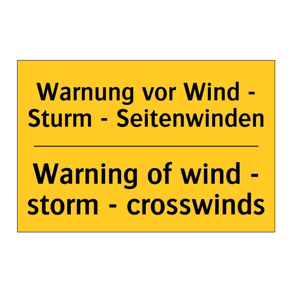 Zweisprachiges Warnschild mit deutschem Text Warnung vor Wind - Sturm - Seitenwinden und englischem Text Warning of wind - storm - crosswinds