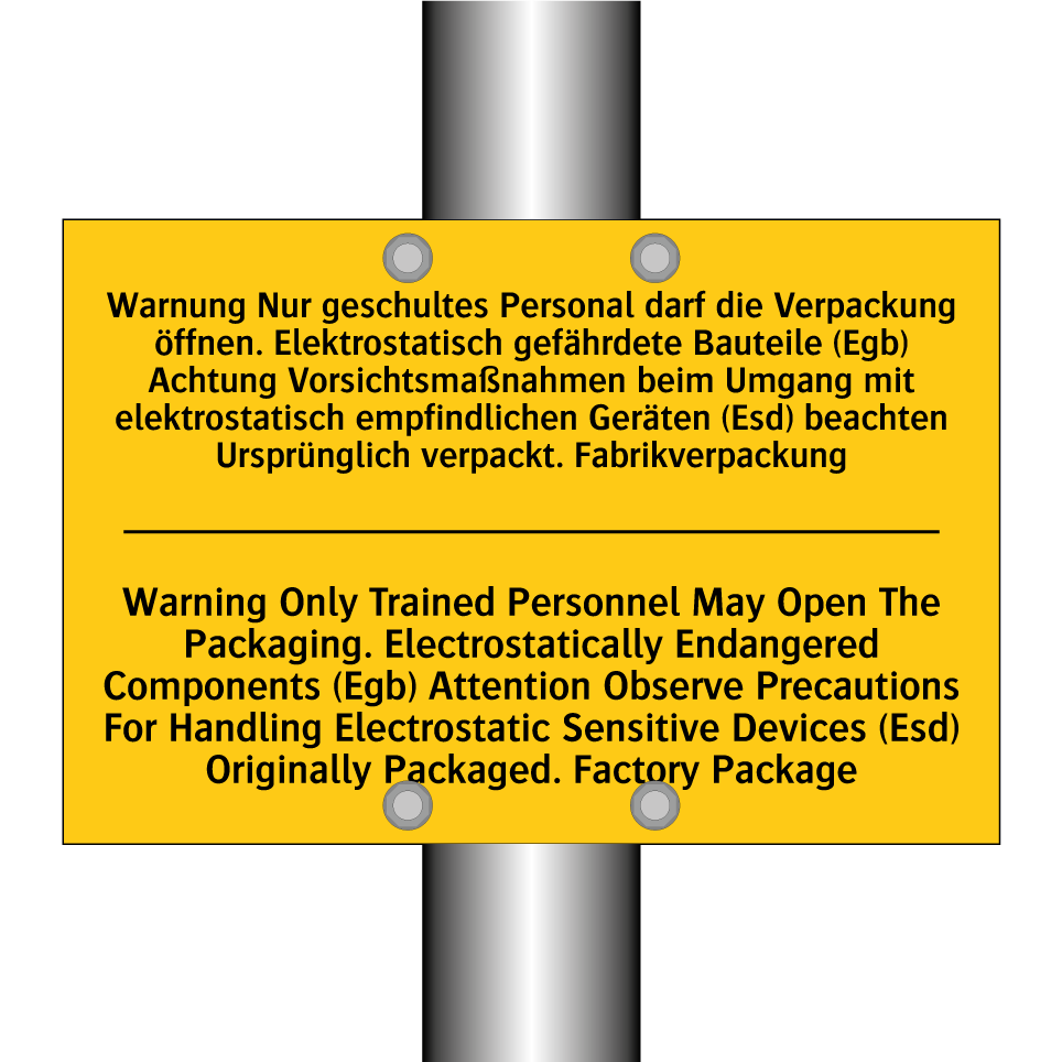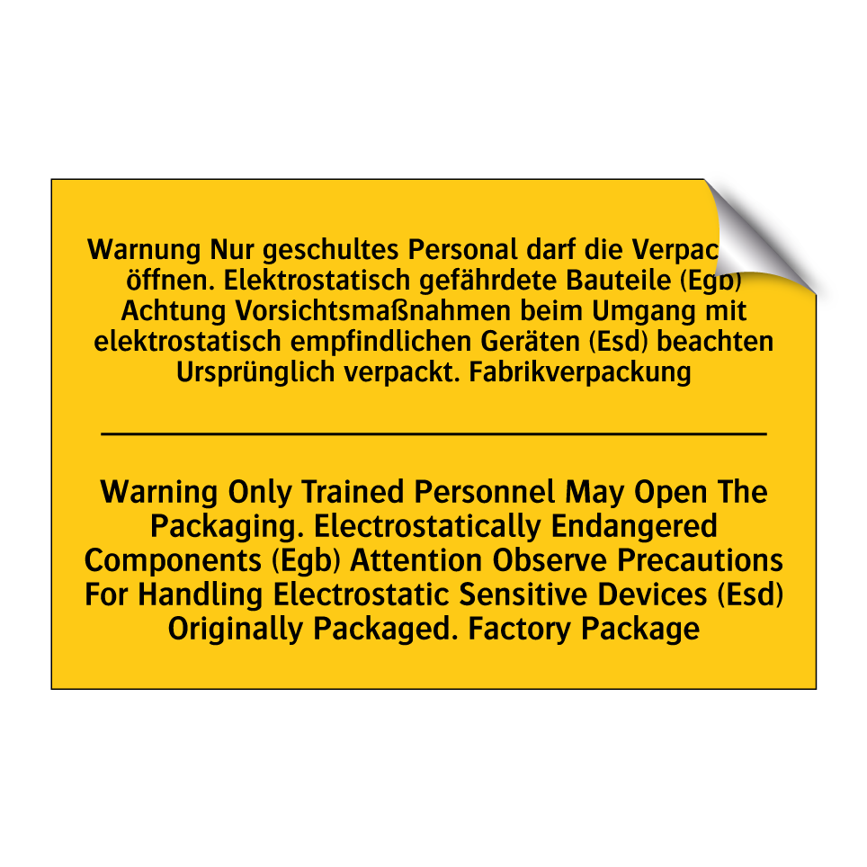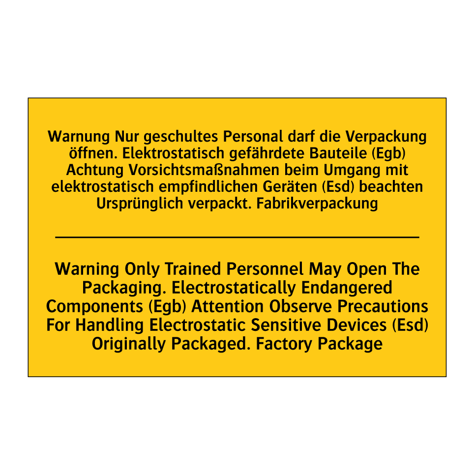 Zweisprachiges Warnschild mit deutschem Text Warnung Nur geschultes Personal darf die Verpackung öffnen. Elektrostatisch gefährdete Bauteile (Egb) Achtung Vorsichtsmaßnahmen beim Umgang mit elektrostatisch empfindlichen Geräten (Esd) beachten Ursprünglich verpackt. Fabrikverpackung und englischem Text Warning Only Trained Personnel May Open The Packaging. Electrostatically Endangered Components (Egb) Attention Observe Precautions For Handling Electrostatic Sensitive Devices (Esd) Originally Packaged. Factory Package