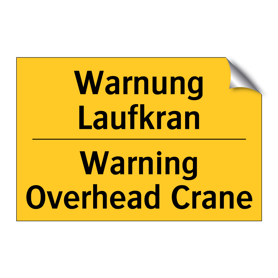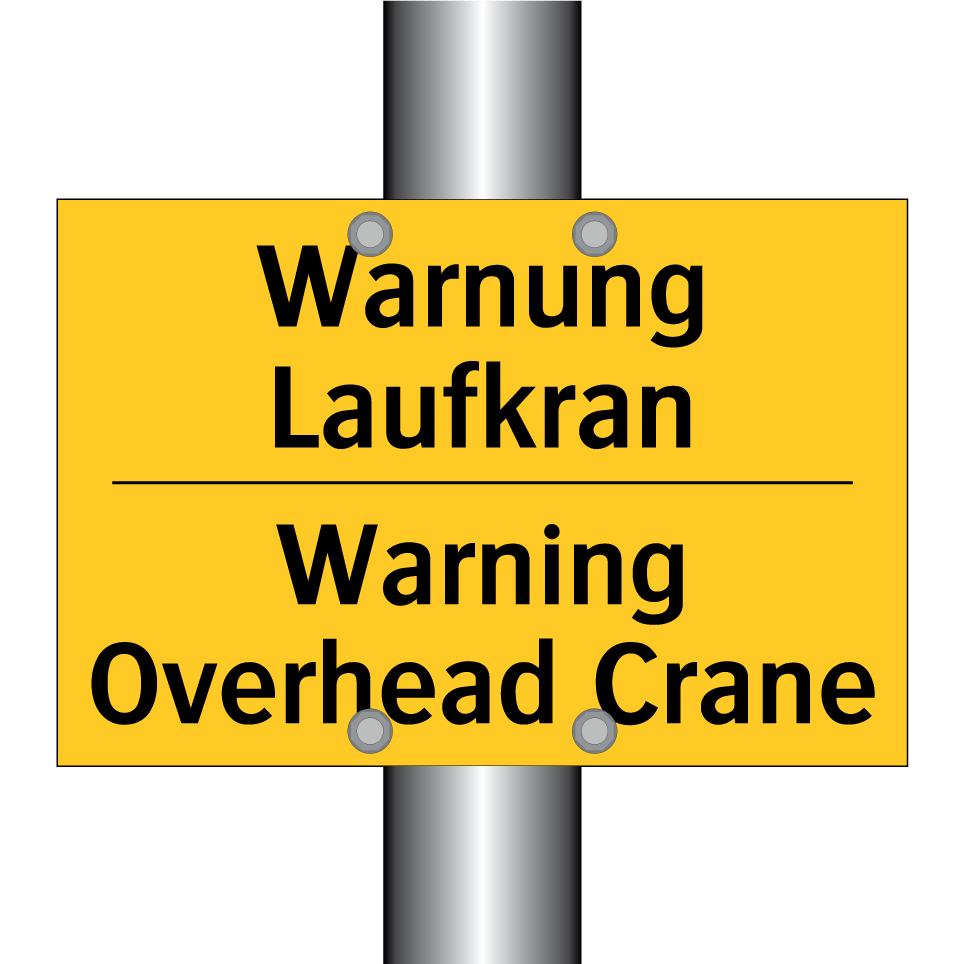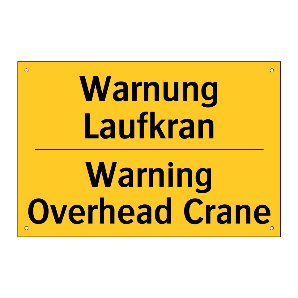 Zweisprachiges Warnschild mit deutschem Text Warnung Laufkran und englischem Text Warning Overhead Crane