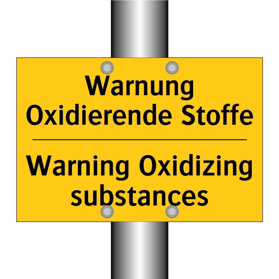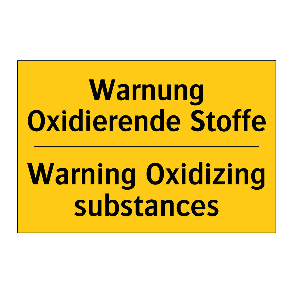 Zweisprachiges Warnschild mit deutschem Text Warnung Oxidierende Stoffe und englischem Text Warning Oxidizing substances